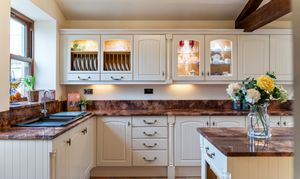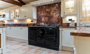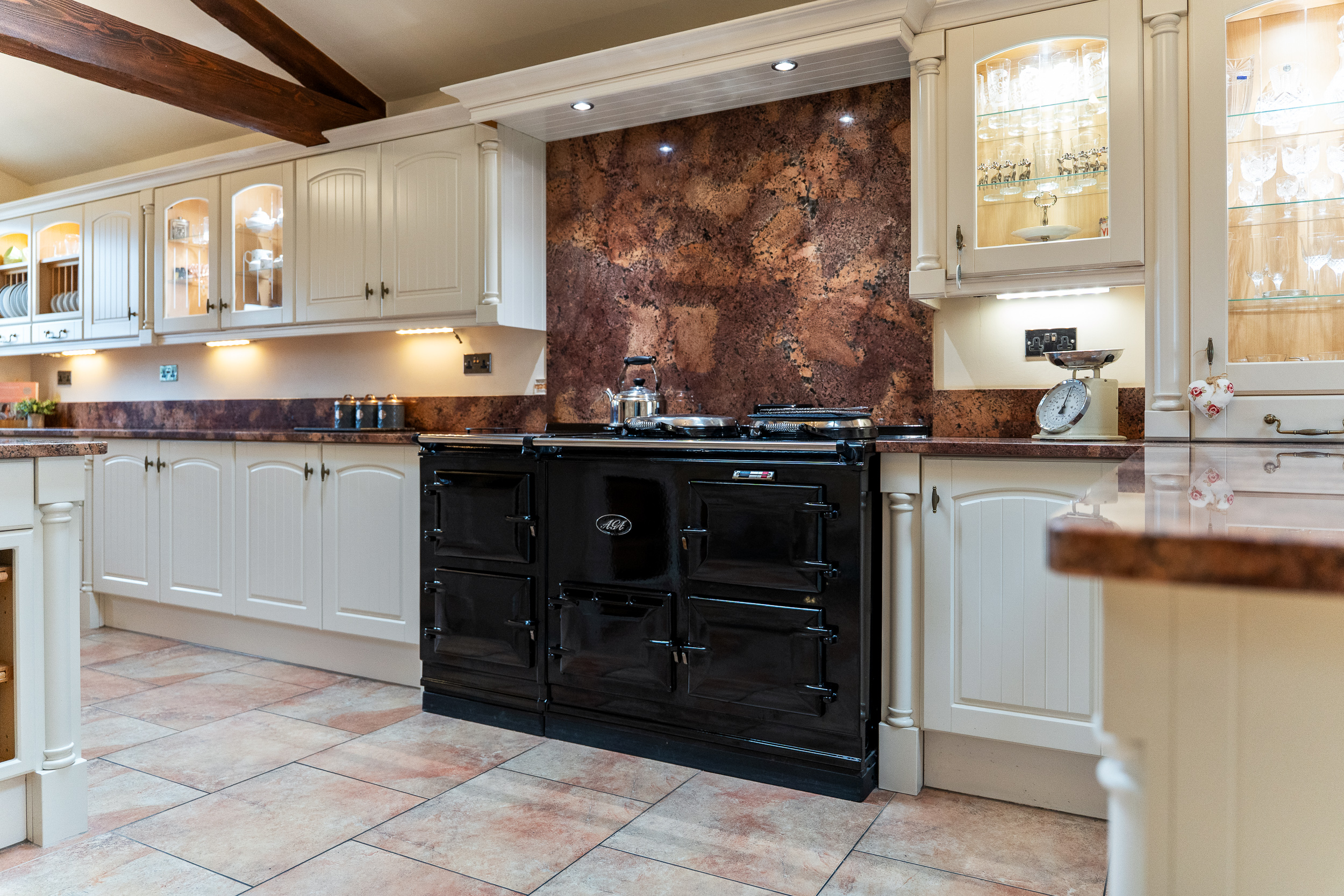 The kitchen is finished in a classic country cream style with granite worktops, arranged around a traditional four-oven AGA range cooker that creates a natural focal point and reinforces the home’s farmhouse character.