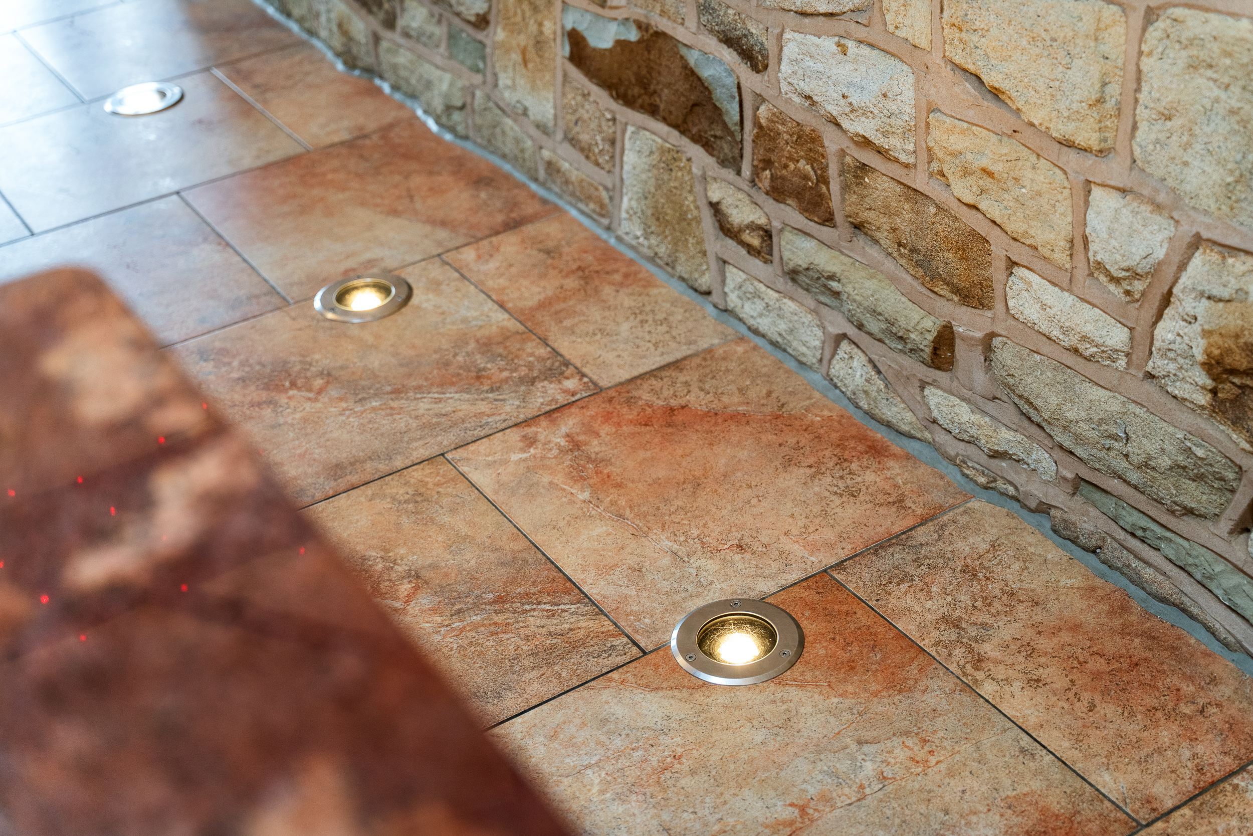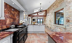 A central island provides additional preparation space and informal seating, while illuminated display cabinets and generous cabinetry ensure ample storage. Above, exposed beams span the vaulted ceiling, while Velux rooflights introduce plenty of natural light. Underfoot, porcelain tiled flooring with underfloor heating keeps the space comfortable year-round, complemented by a stone feature wall with subtle floor lighting.