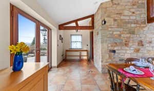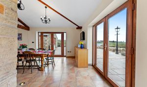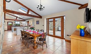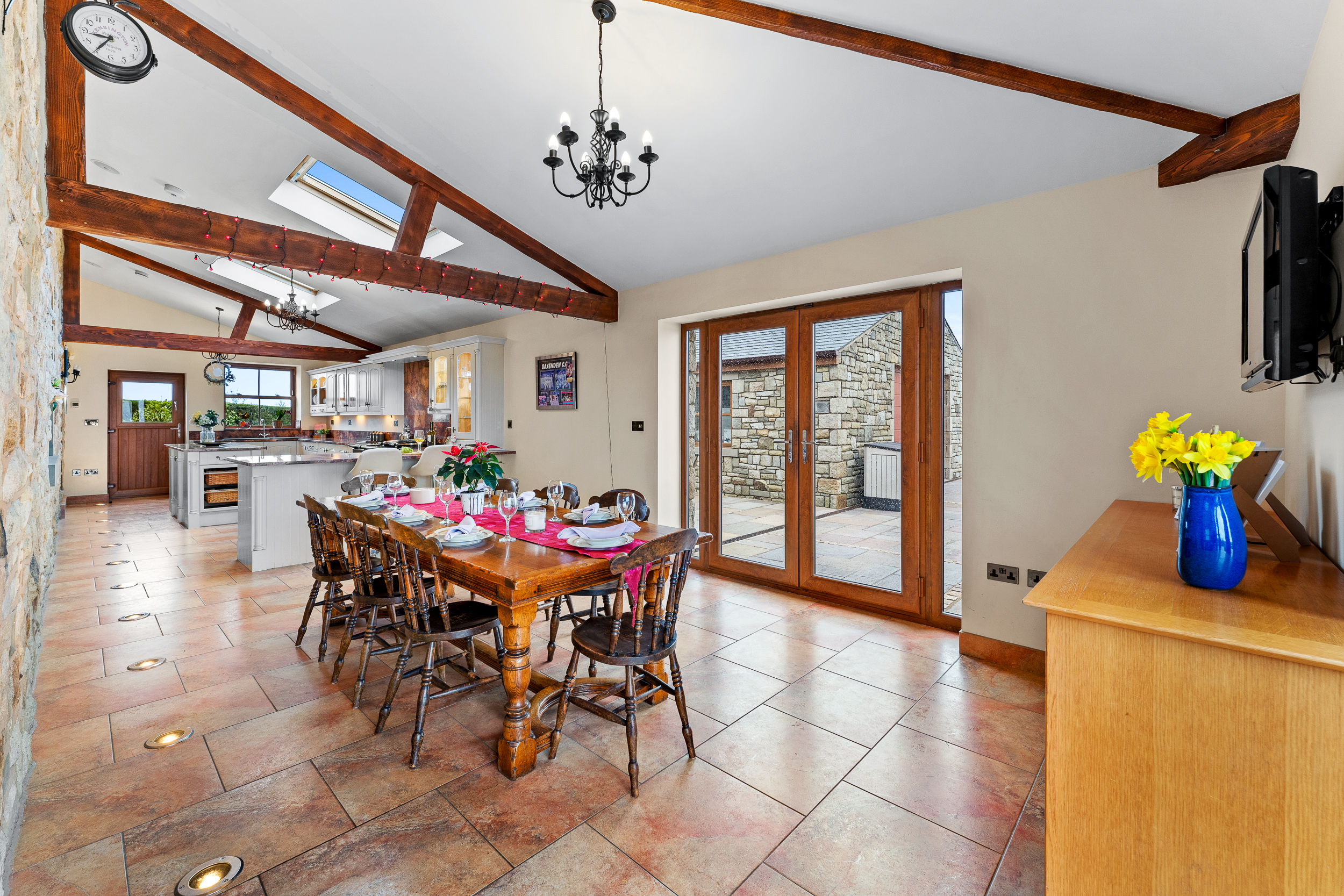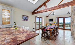 The kitchen flows seamlessly into a generous dining and living area, where large glazed doors and windows frame the surrounding countryside. These open directly onto the Indian stone terrace, creating an easy connection between indoor and outdoor living during warmer months.