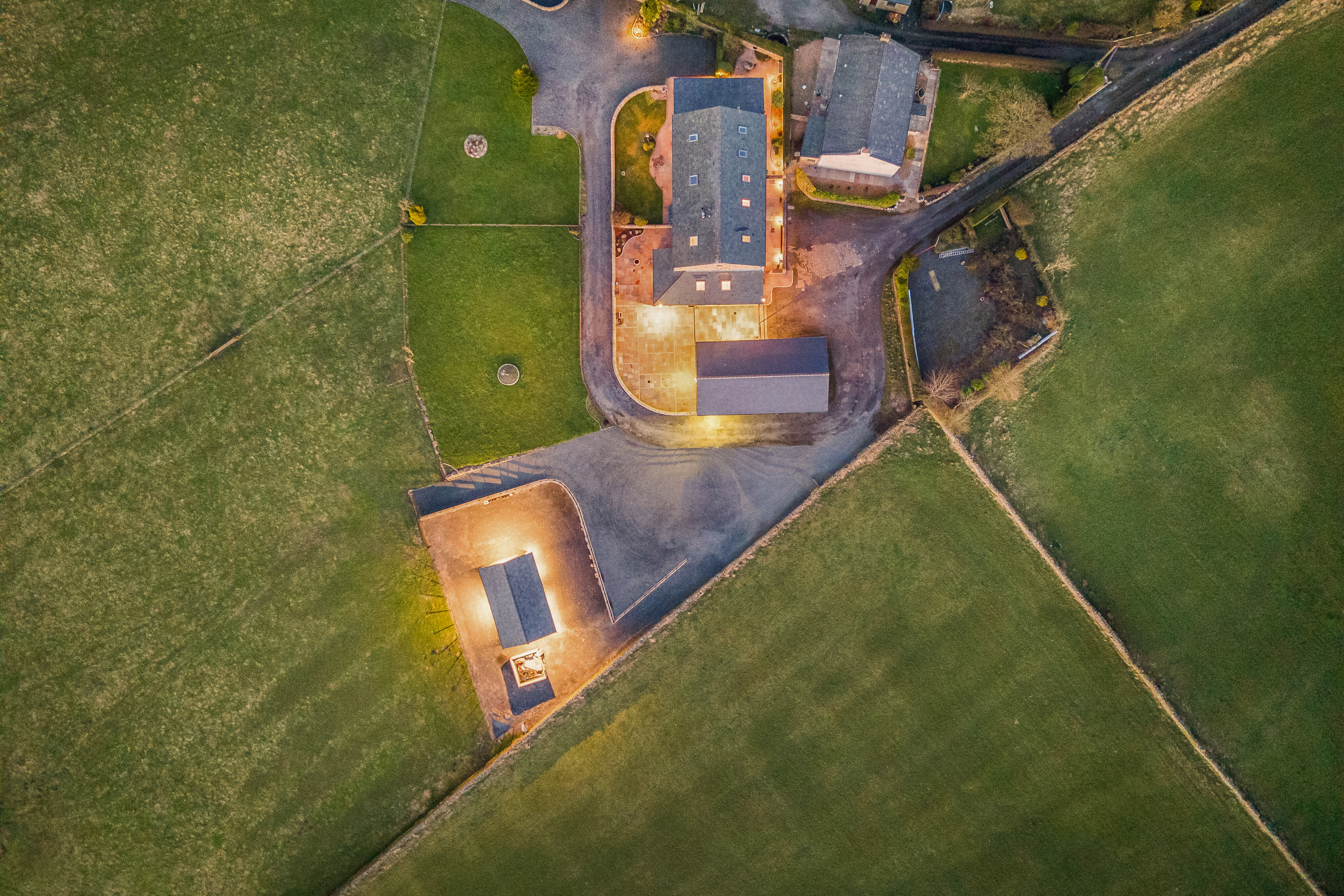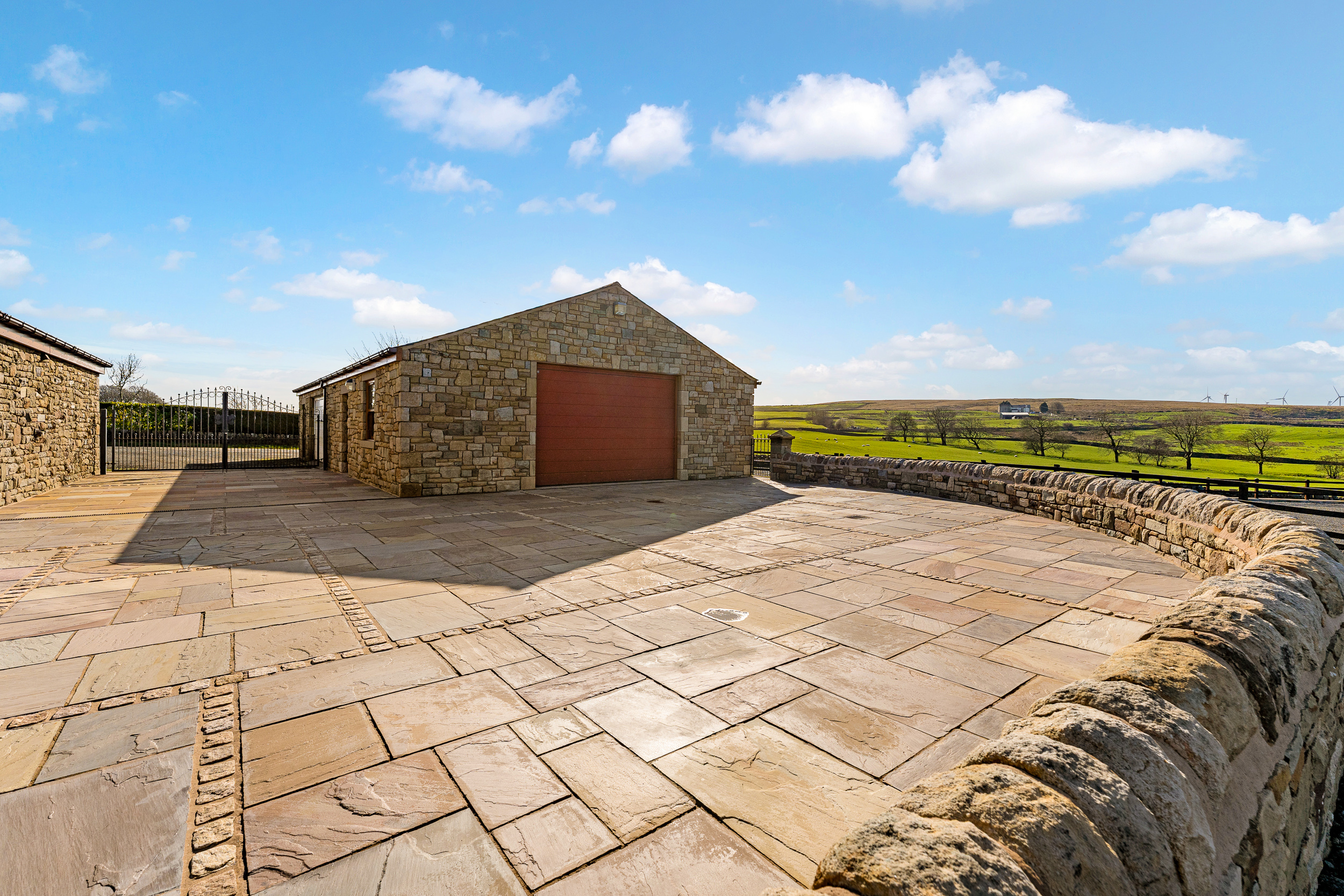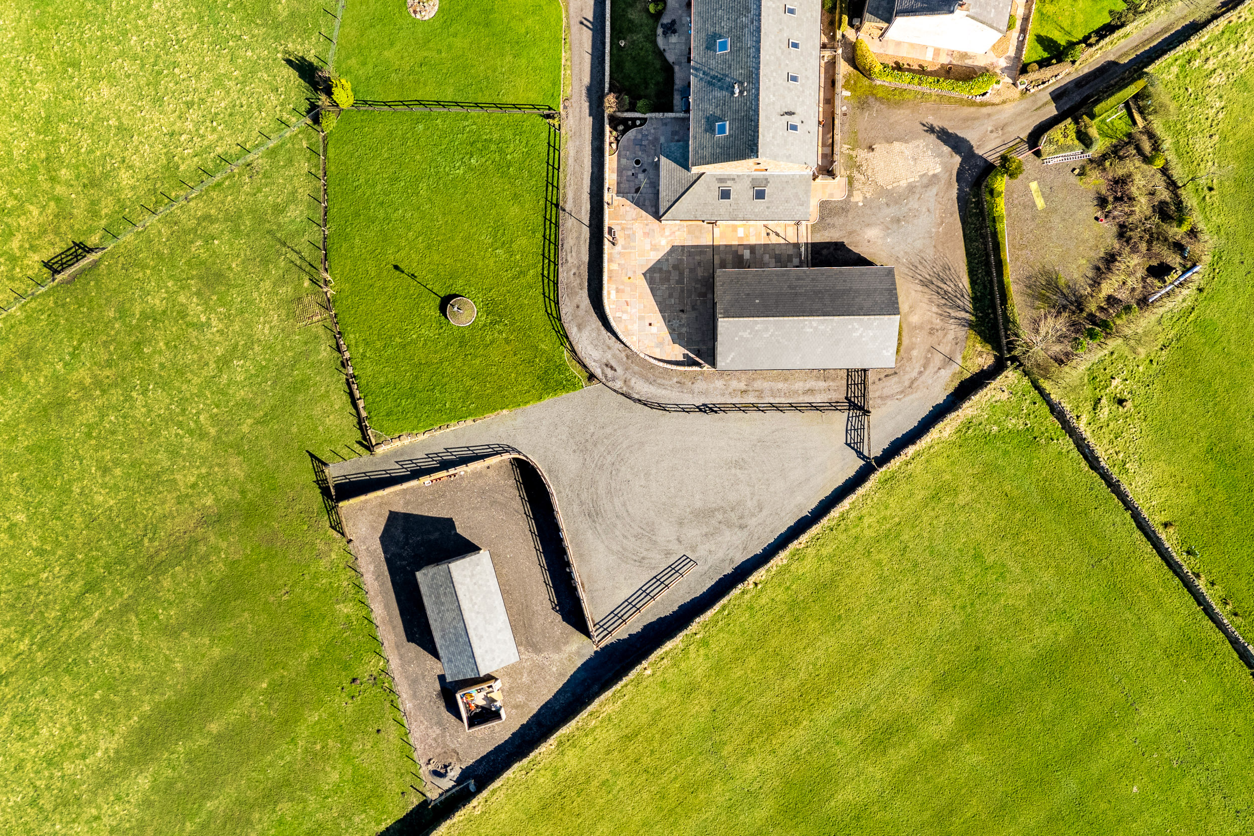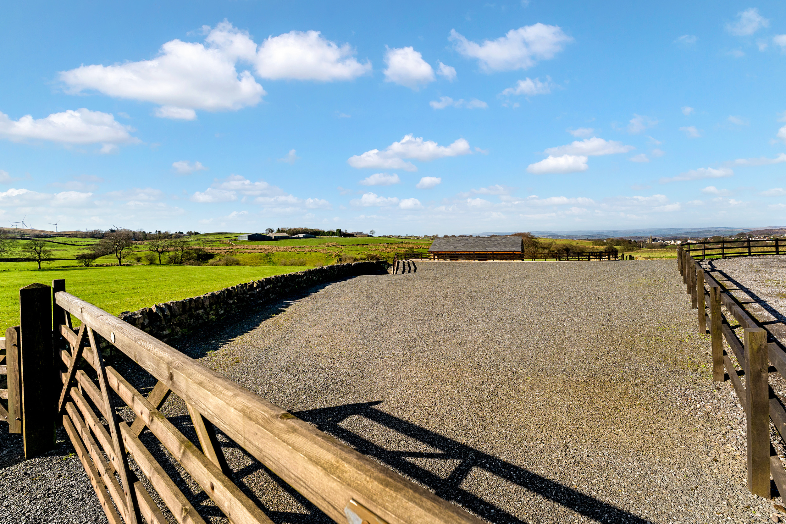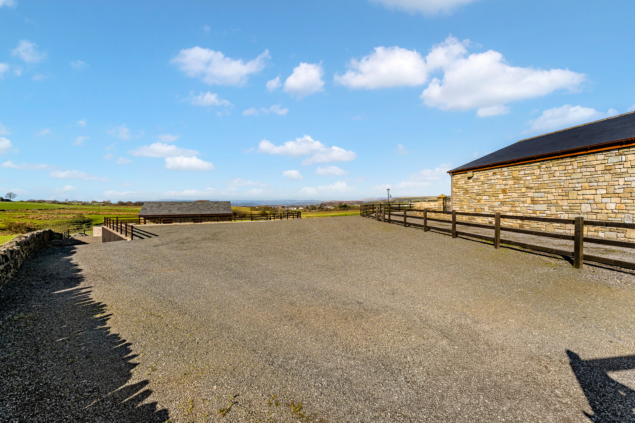 Beyond the gates lies a spacious driveway providing extensive parking, leading to the triple garage with WC. The grounds extend across lawned areas, Indian stone terraces and landscaped sections leading towards the stables and fenced paddock, offering plenty of space for outdoor entertaining, family life or equestrian use.