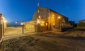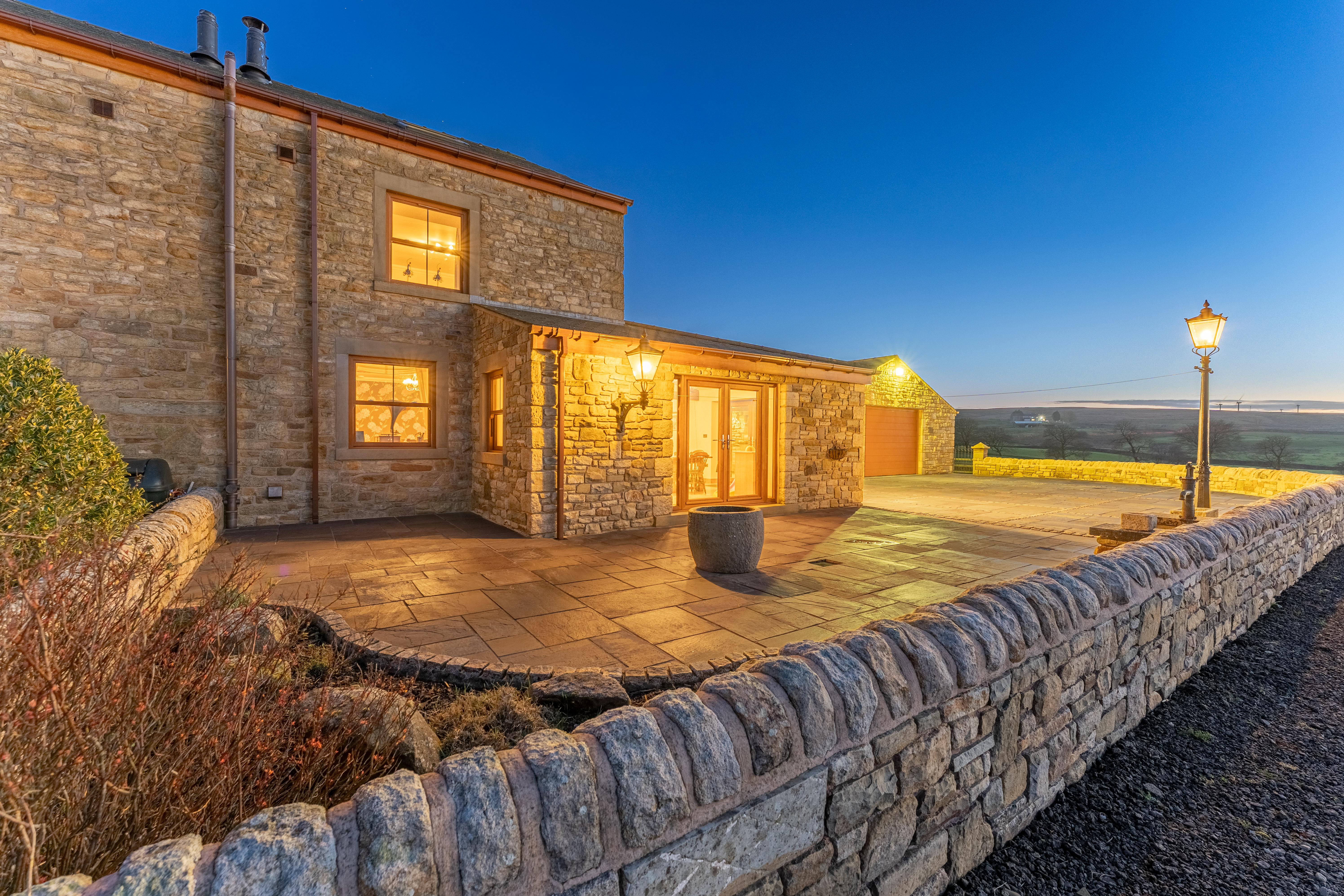Approached from Roundhill Lane, the barn presents an attractive stone façade framed by iron railings and a paved front courtyard, immediately hinting at the character within. Traditional cast-iron lampposts with copper Victorian lanterns add charm and atmosphere, complementing the warm stonework and timber-framed windows.