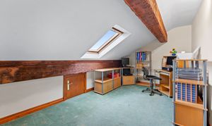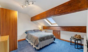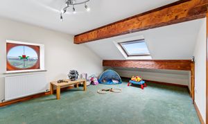 Elsewhere, the rooms remain equally versatile. One bedroom enjoys a striking arched feature window overlooking the courtyard, while the top floor reveals some of the barn’s most characterful spaces, where exposed structural beams and rooflights create distinctive rooms full of charm. A stained-glass circular window adds another unique architectural detail.