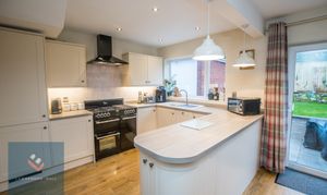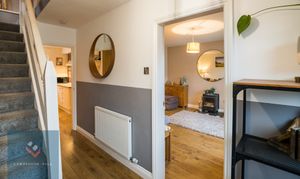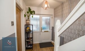 Entering the property into this stylishly decorated and spacious hallway. Stairs rising. Oak doors leading through to the kitchen and lounge. Radiator. Laminate flooring. Understairs storage cupboard.