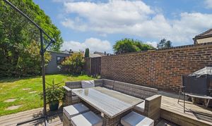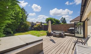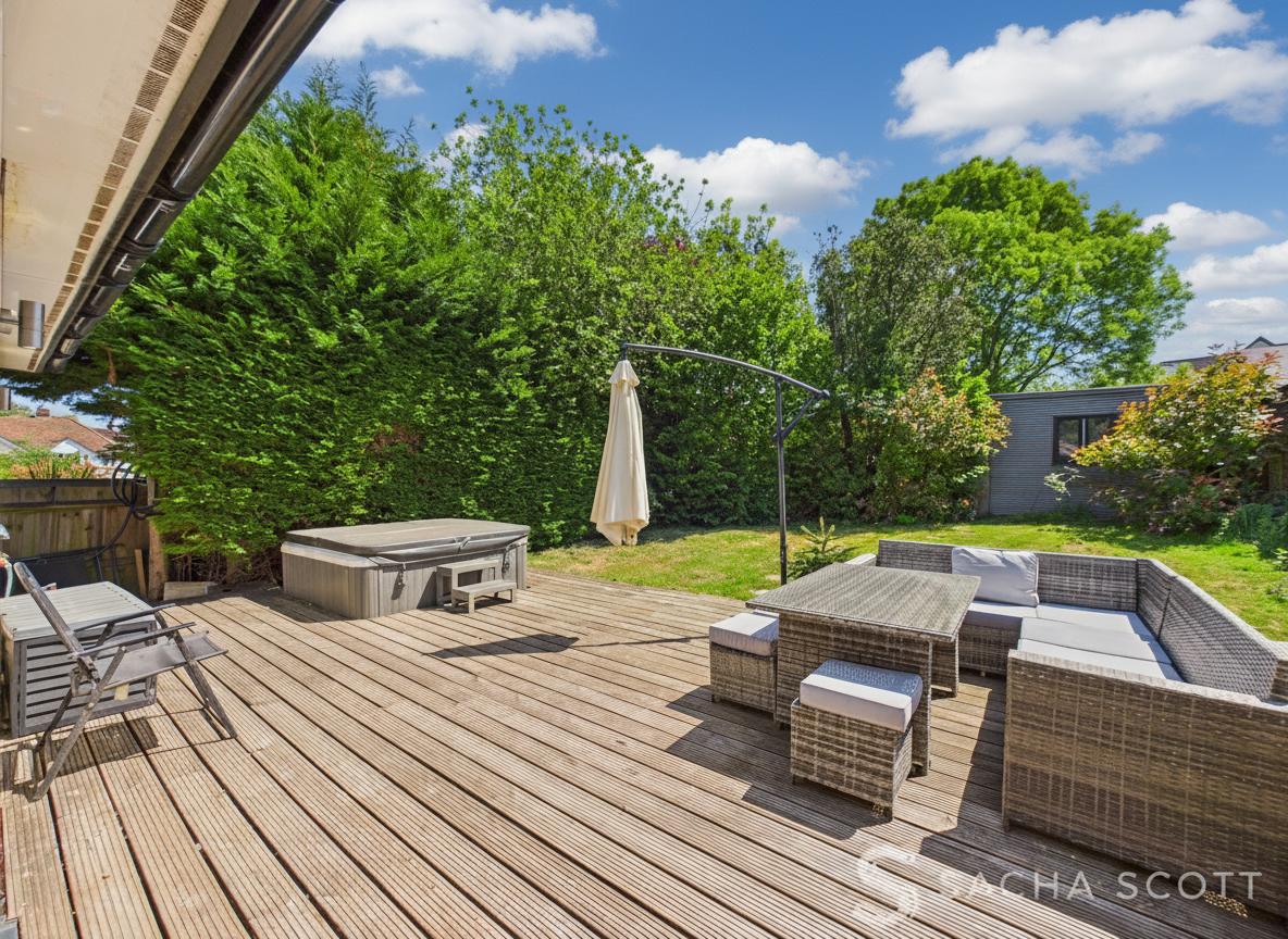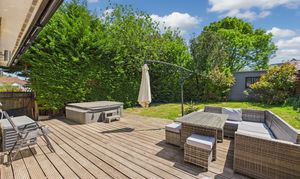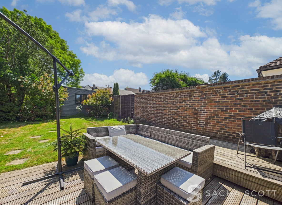 South east facing 75ft x 30ft garden, the substantial garden provides a large deck, lawn and garden studio, external lighting and side access.