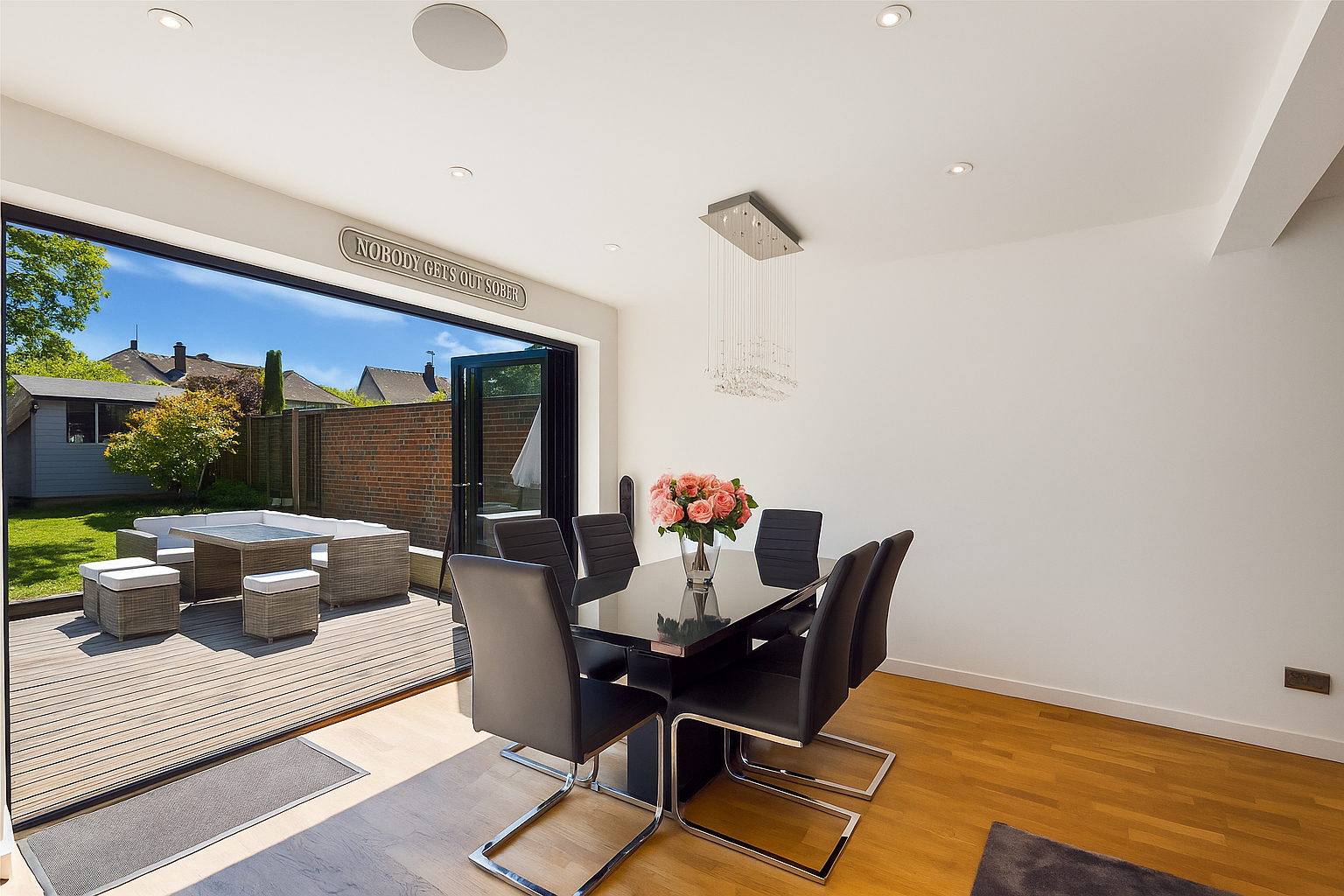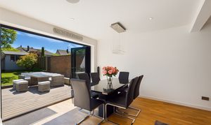 Overlooking the rear of this fabulous bungalow, the open plan lounge/diner benefits from modern, neutral decor and sliding doors onto the garden decking.