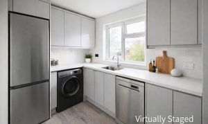Internally, the flat offers a private entrance leading to a spacious hallway, a bright and airy living room with plenty of natural light, and a separate fitted kitchen complete with base and wall units, electric oven, gas hob, washing machine, and fridge freezer.