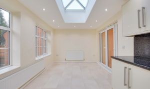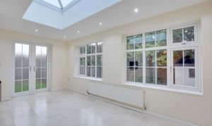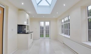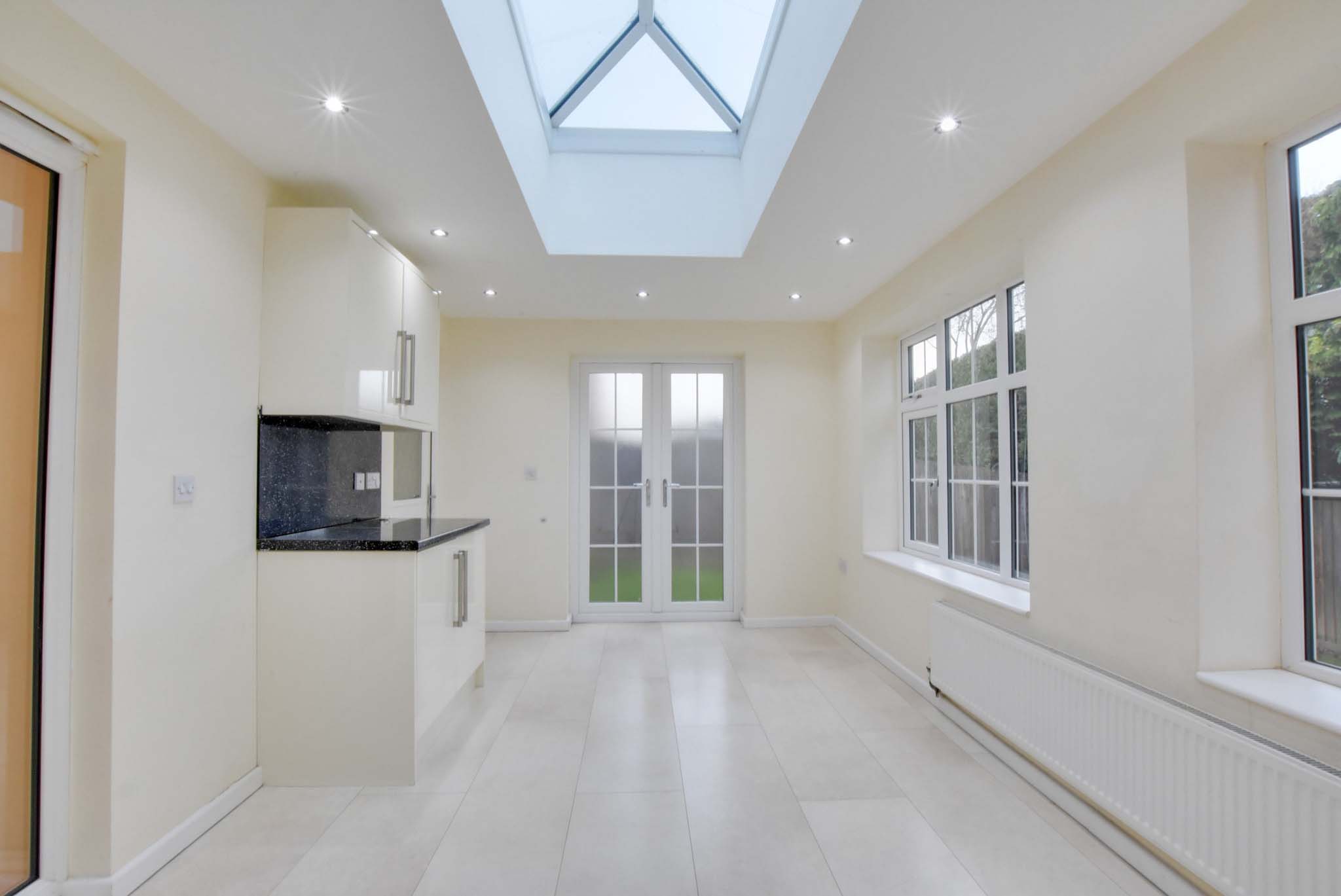 Features double-glazed French doors to the rear garden, two double-glazed windows to the rear elevation, a skylight lantern, inset ceiling spotlights, tiled flooring, two radiators, and additional wall and base units with a work surface.