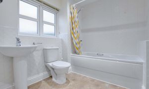Includes double-glazed window to the front elevation, bath with mixer tap and shower attachment, pedestal wash hand basin, low-level WC, and a radiator.