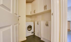 (narrowing to 0.8m) Includes wall and base units, tiled floor, and plumbing for a washing machine.