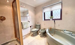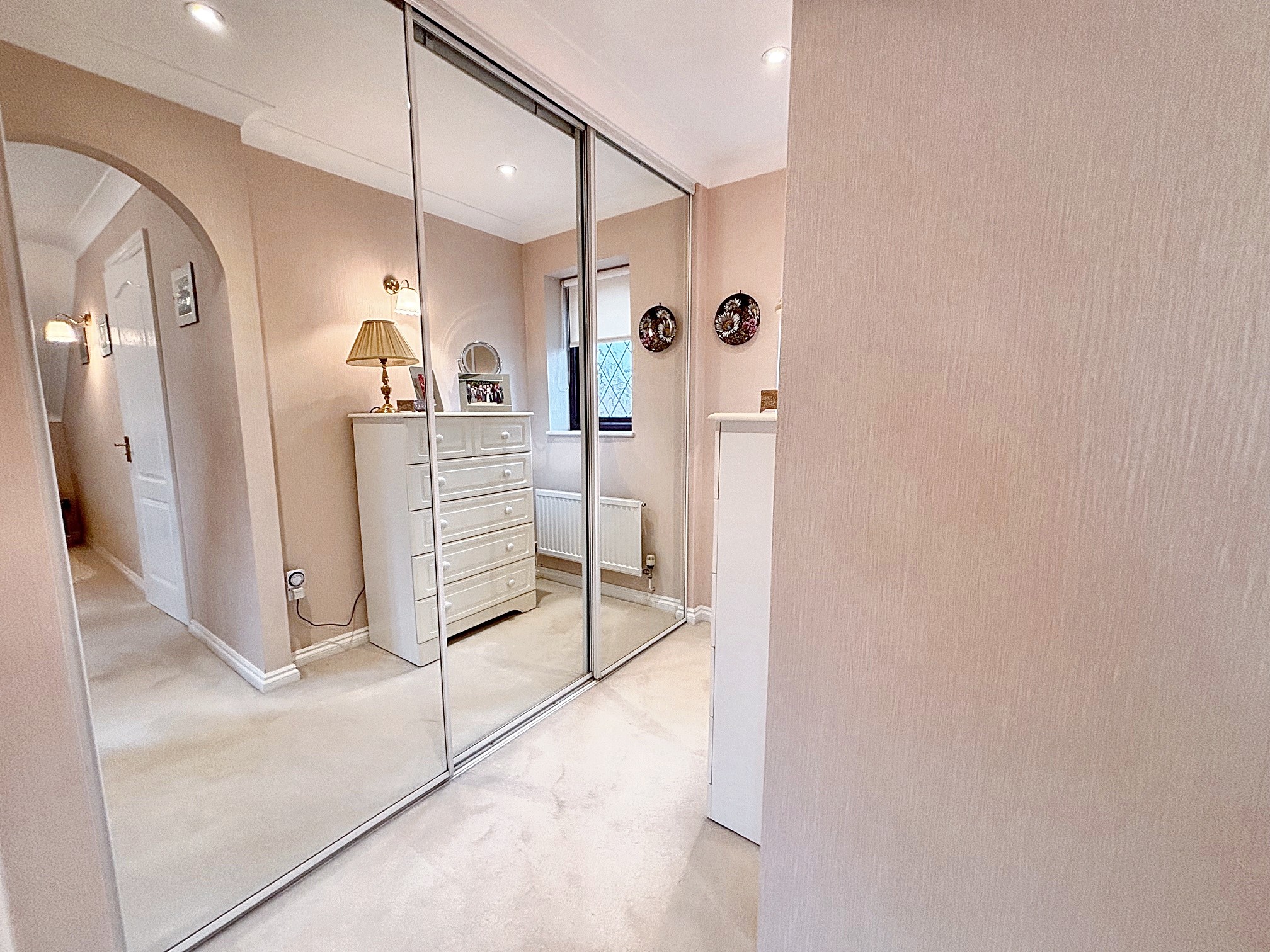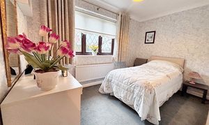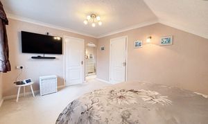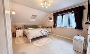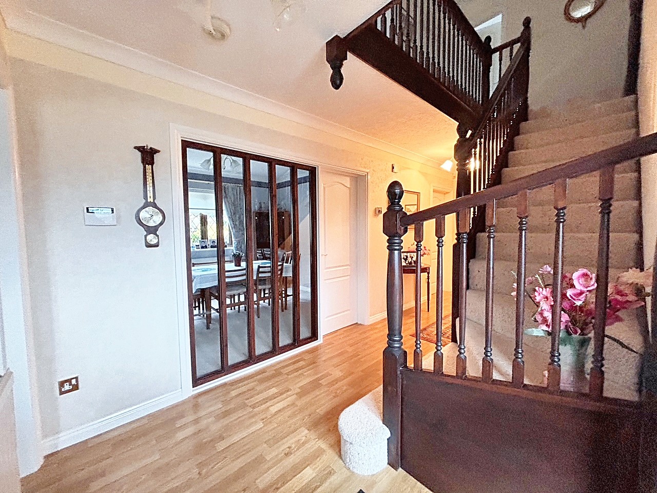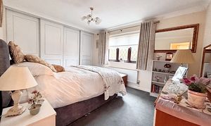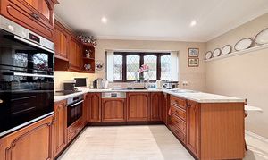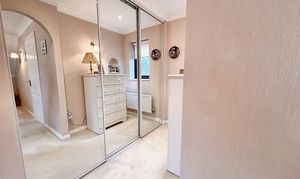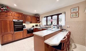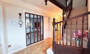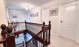 Upstairs, a galleried landing leads to five bedrooms; four of which are double bedrooms with fitted wardrobes, while the fifth is a generously sized single room. The master bedroom is a true retreat, featuring a dressing area, en suite shower room, and even a sauna for ultimate relaxation. The beautifully maintained rear garden provides ample space for children to play and boasts three patio areas for outdoor entertaining. The property’s exterior reflects the same level of care and attention to detail as the interior, creating a harmonious blend of comfort, style, and functionality that makes this home a truly special find. A large double garage and ample driveway parking complete this exceptional home, with the added benefit of a new boiler fitted in November 2025.