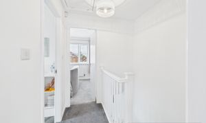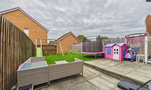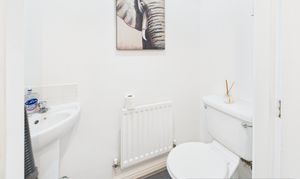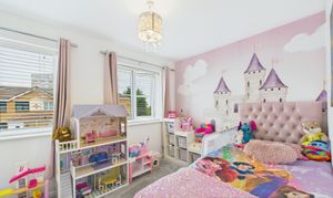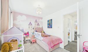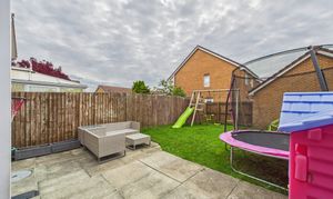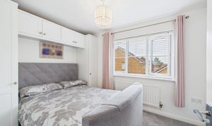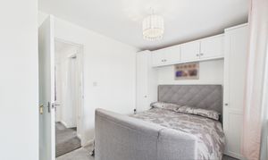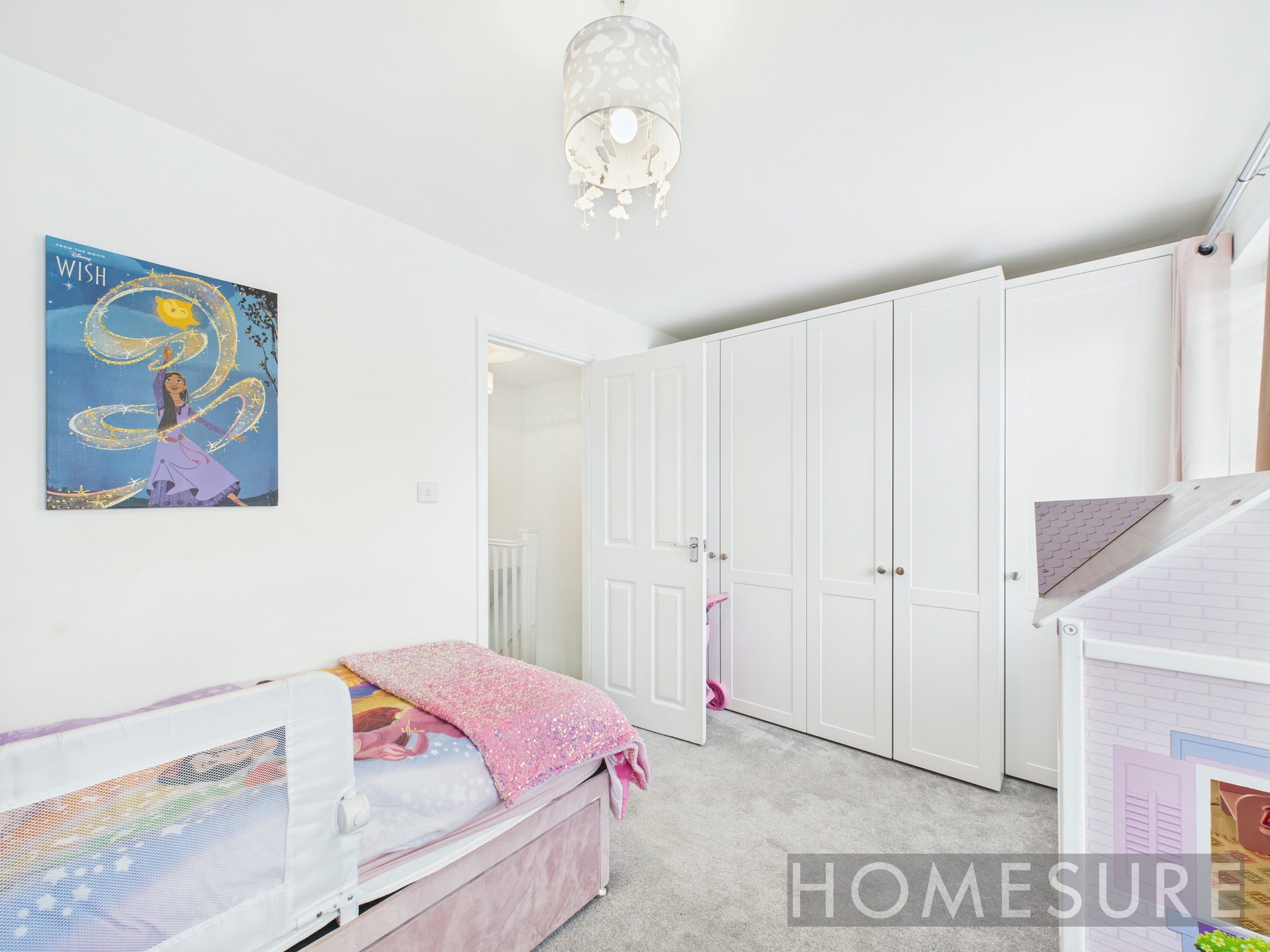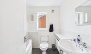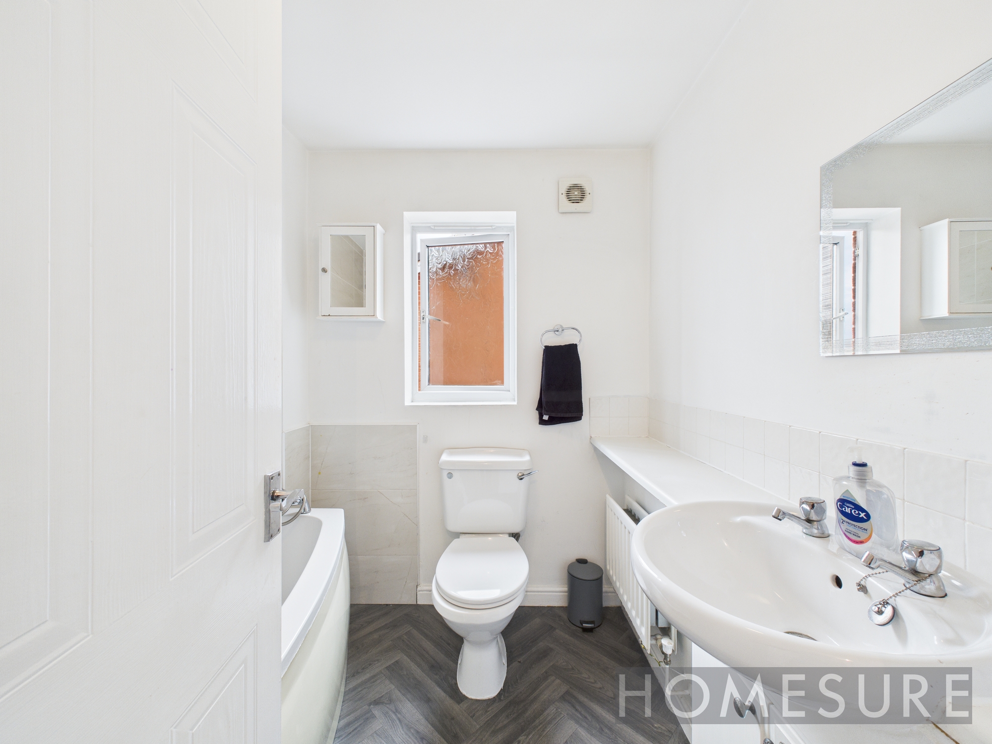 The property’s contemporary bathroom includes a curved bath-tub, modern fixtures, and elegant tile design, providing a relaxing retreat. Outside, the generous private garden is ideal for families, boasting a dedicated a patio seating space for relaxation and entertaining. Off-road parking and a well-maintained front garden add further convenience and kerb appeal. With its thoughtful layout and high-quality finishes, this home is designed to accommodate modern lifestyles and offers an inviting environment for both every-day living and special occasions.