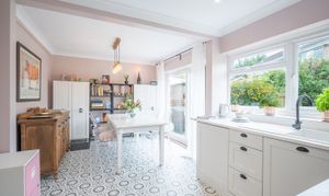 At the heart of the home, the refitted kitchen/dining room provides a bright and practical space for everyday living and entertaining, with fitted units, integrated appliances, and direct access to the rear garden. Beyond the kitchen, the garage conversion adds a generous utility room, cloakroom, and boot room, providing a rare level of practicality and convenience. The remaining garage space offers additional storage.