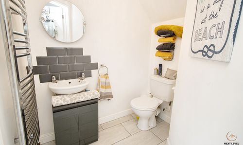 This useful cloakroom has a close coupled wc and a hand basin with vanity storage unit below. There is a heated towel rail and a tiled floor.