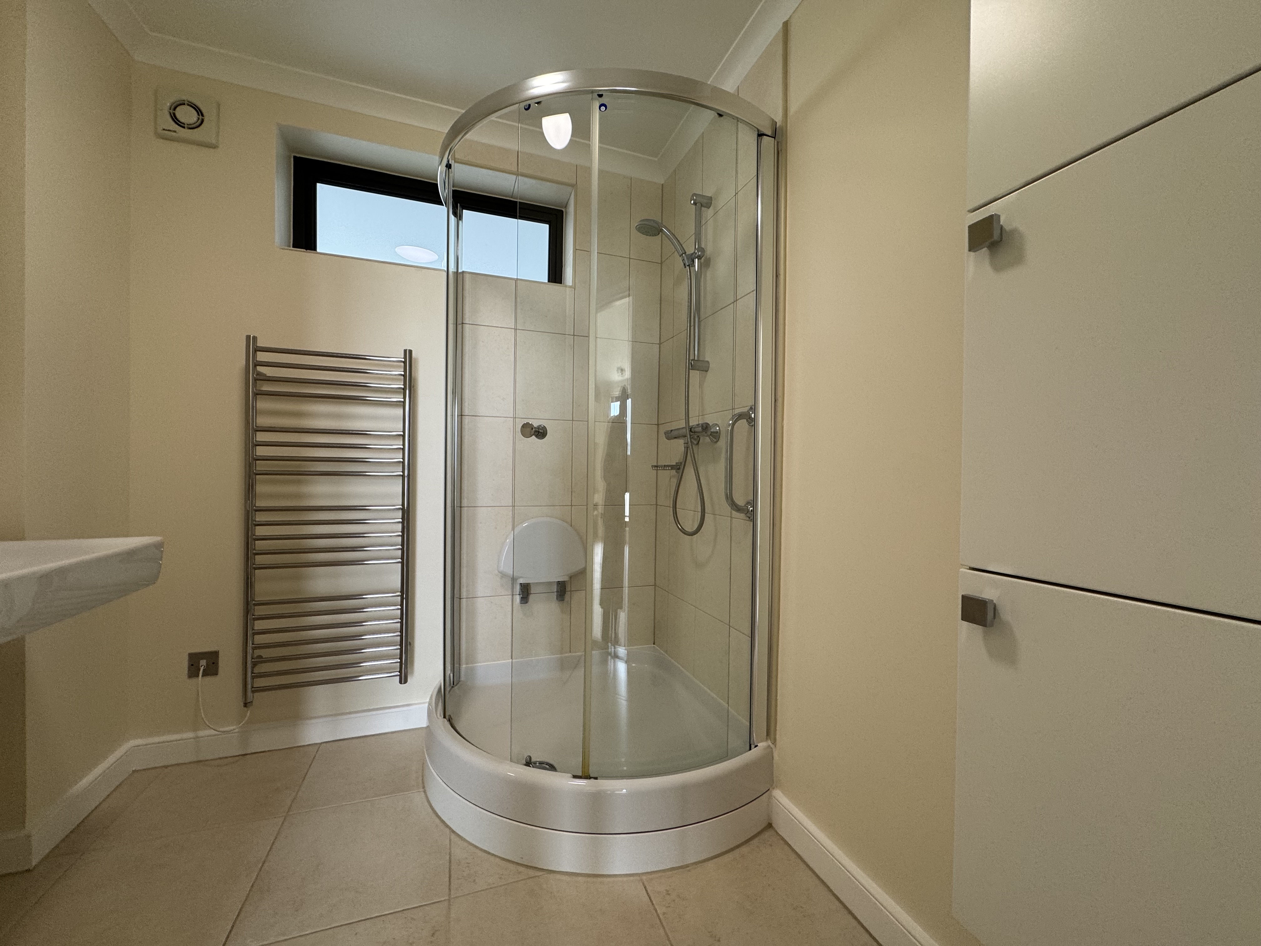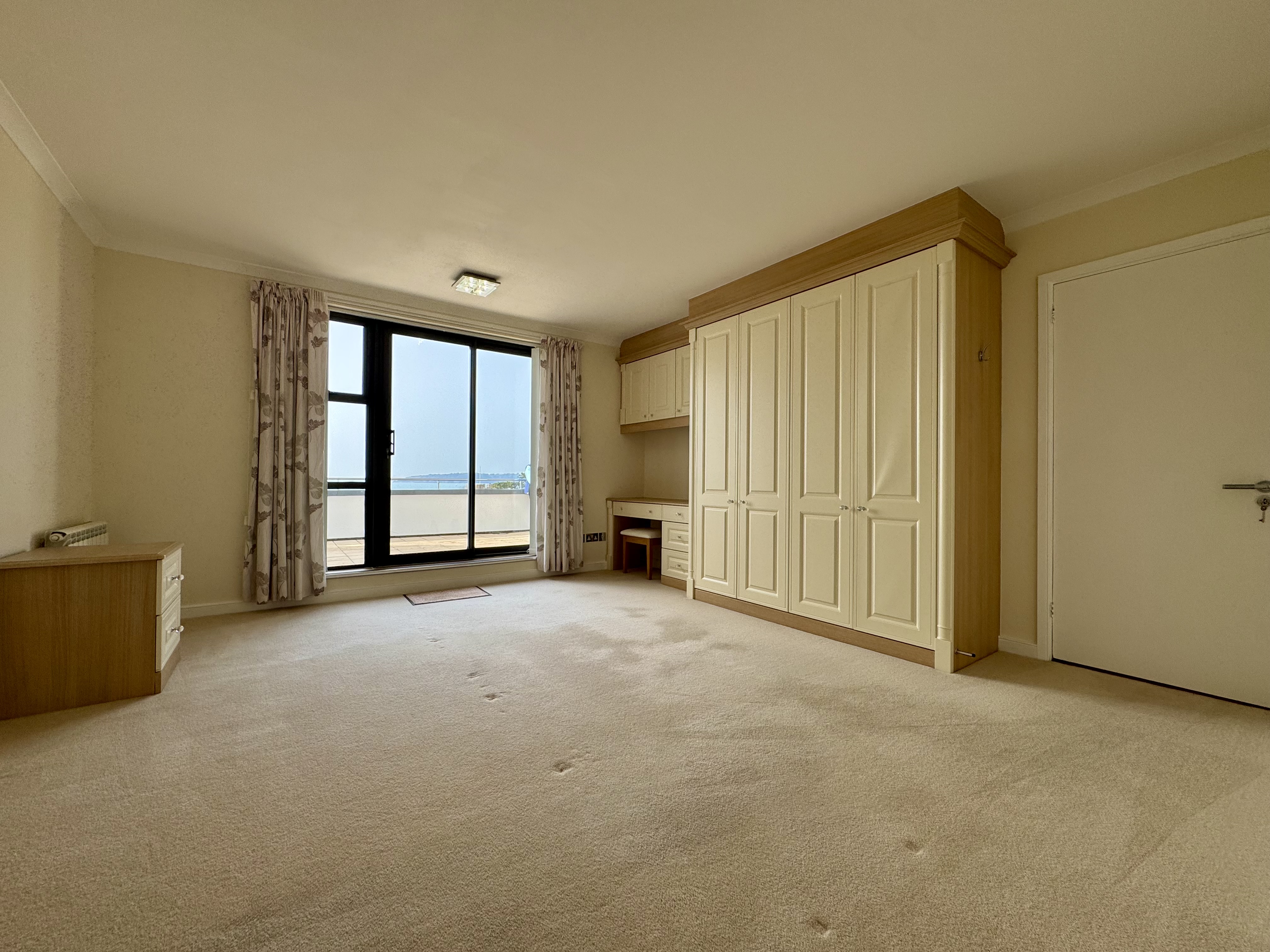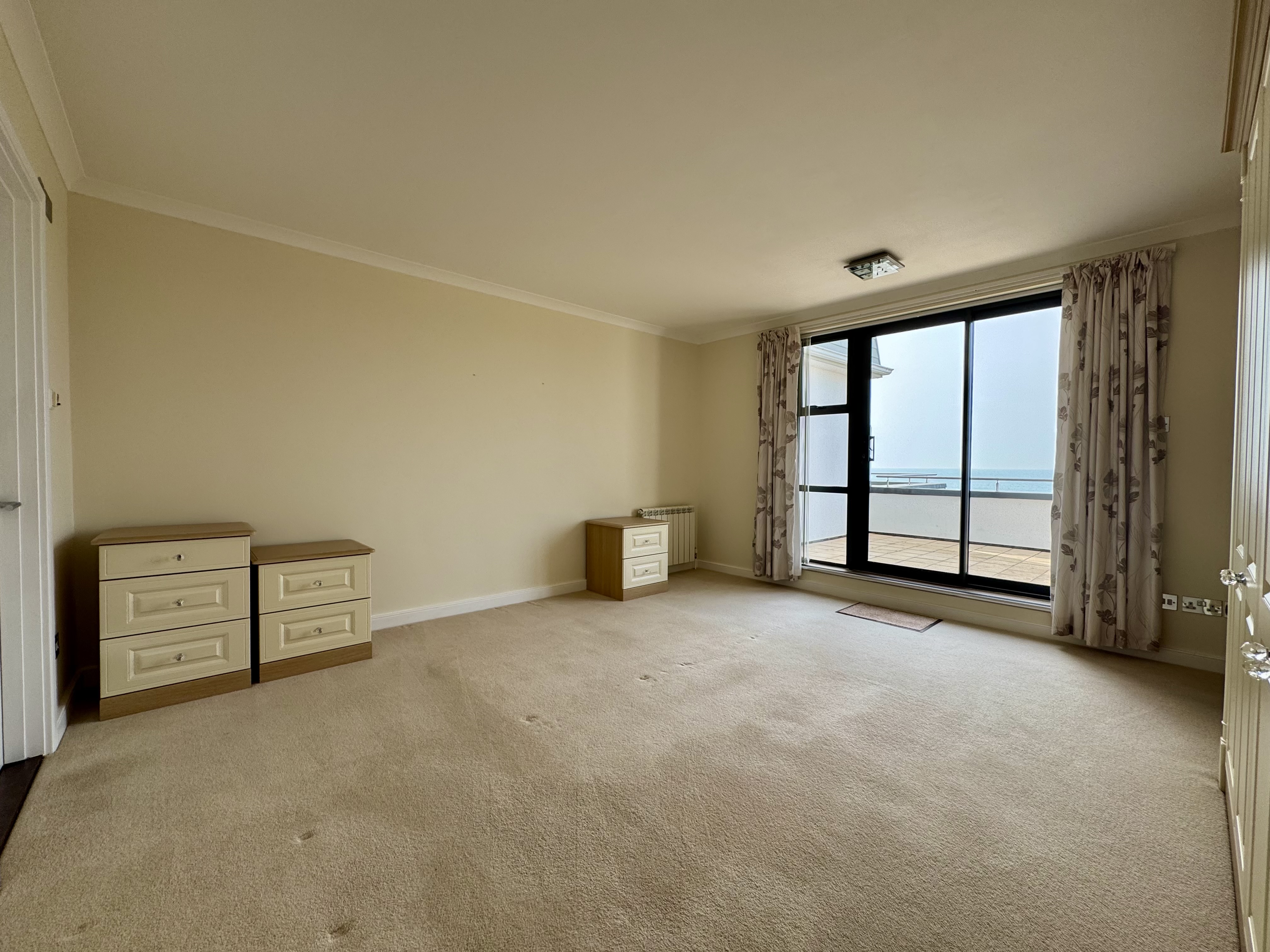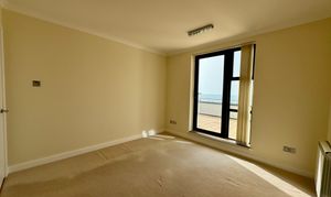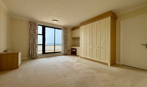 Both bedrooms are generously sized and include fitted wardrobes for ample storage. The impressive master bedroom benefits from its own en suite bathroom with shower, while the second bedroom is served by a modern house bathroom complete with bath and shower screen. Each bedroom also enjoys direct access to the terrace, allowing you to wake up to fresh sea air and stunning views.