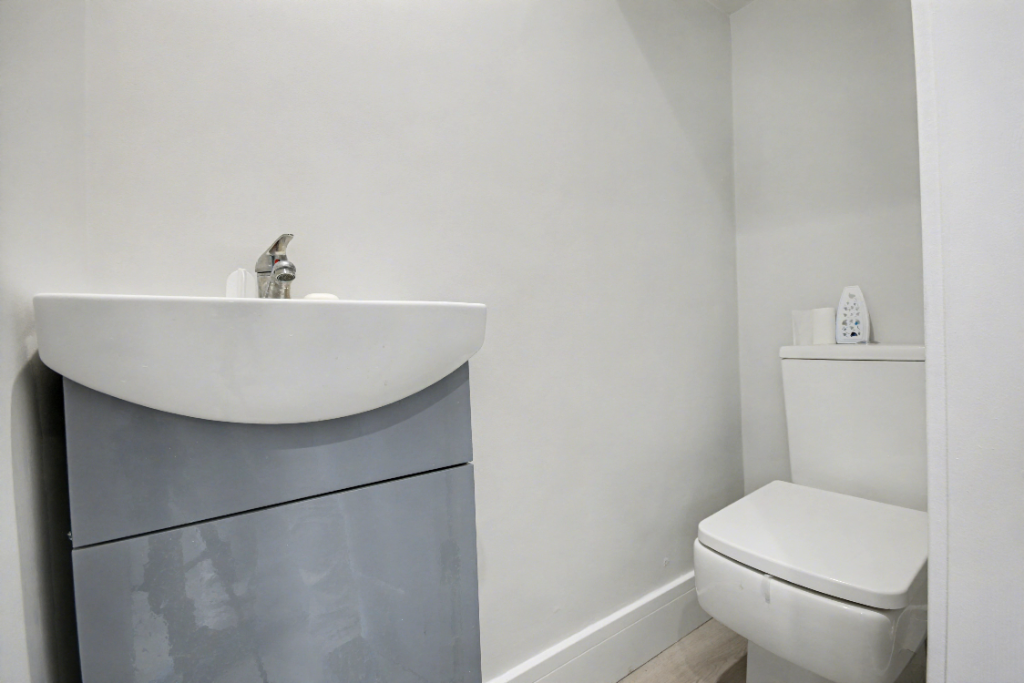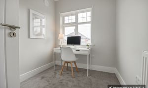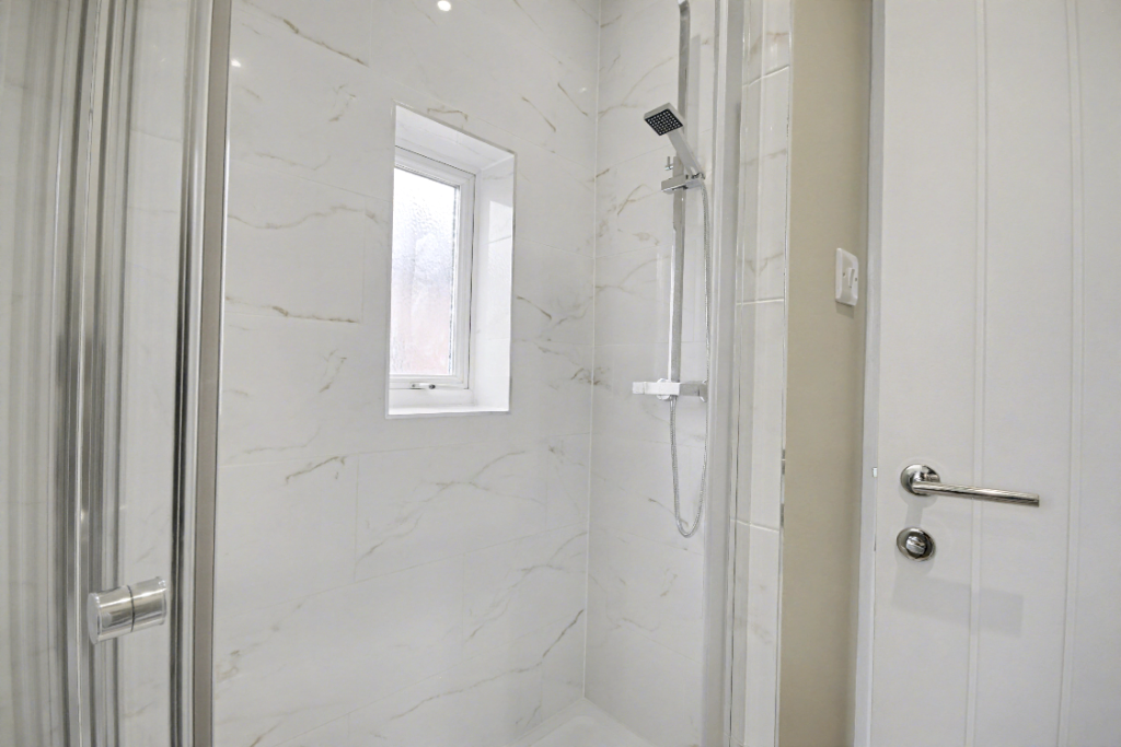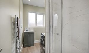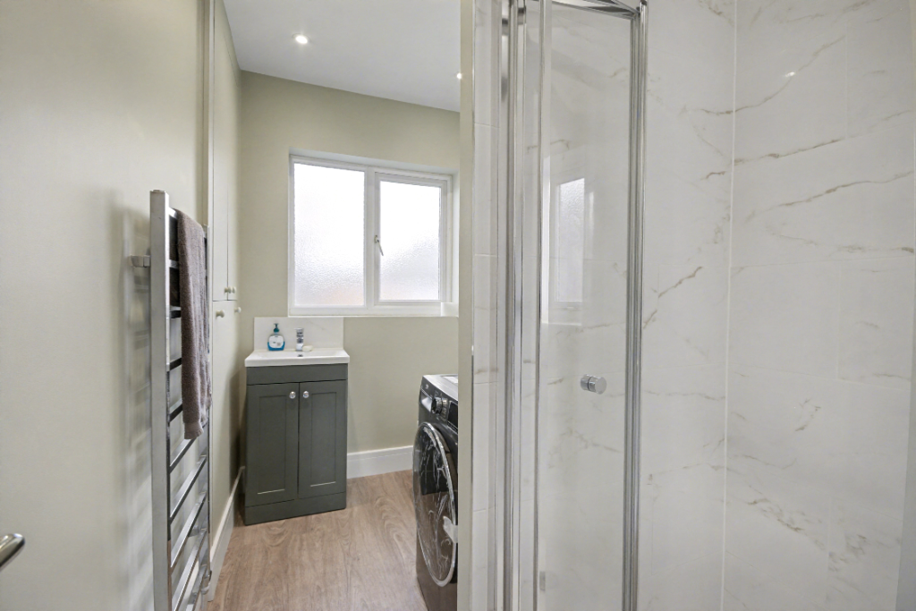 Upstairs, you'll find three bedrooms, all carpeted in soft grey. The two front bedrooms are both spacious doubles with ample room for furniture, while the third bedroom can be used as either a single bedroom or a study space. The brand new family bathroom has been smartly designed with panelled shower walls rather than tiles, making it much easier to keep clean. Taking a cue from European design, the washer-dryer has been installed upstairs, which is surprisingly practical for everyday use.