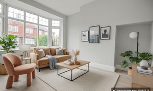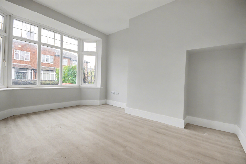 A generously proportioned front reception room with a large bay window and multiple alcoves adding character to the space. Laminate flooring and neutral décor create a clean, contemporary feel. Digital staging images show how the space could be furnished.