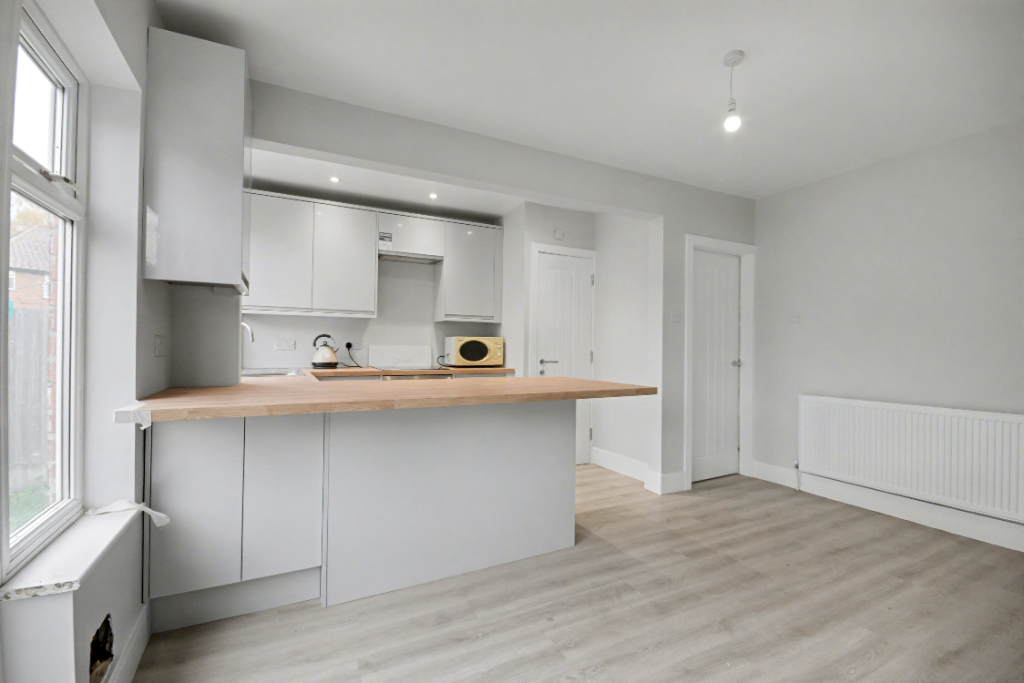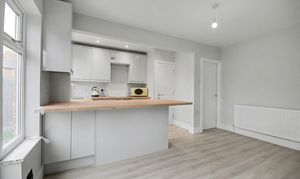 A modern open-plan kitchen diner featuring brand new light grey units with laminate worktops and flooring throughout. The kitchen is fully equipped with a slimline dishwasher, integrated fridge and freezer, plus an electric hob and oven. A large breakfast bar provides a natural connection to the dining space, creating a sociable layout that works well for everyday living.