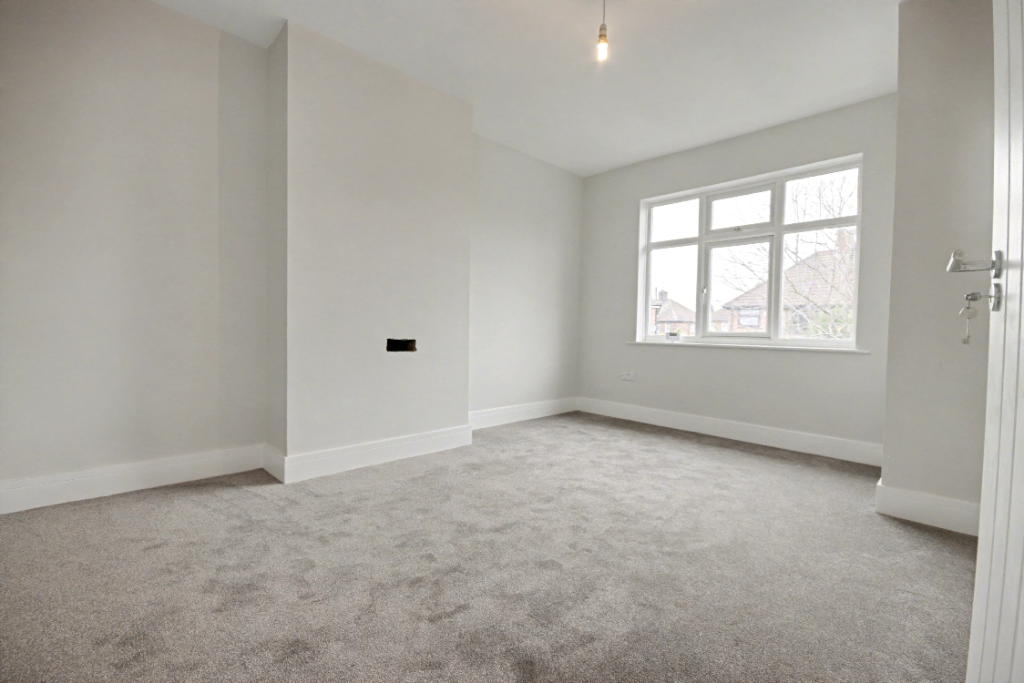 A large double bedroom with ample floor space for a full bedroom suite including a wardrobe, a chest of drawers, bedside tables and a double bed. The room is carpeted in soft grey and has been digitally staged to demonstrate the layout potential.