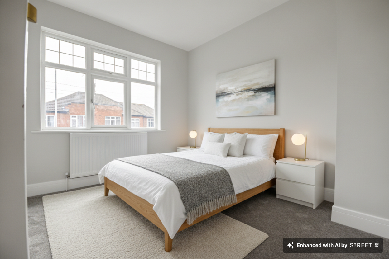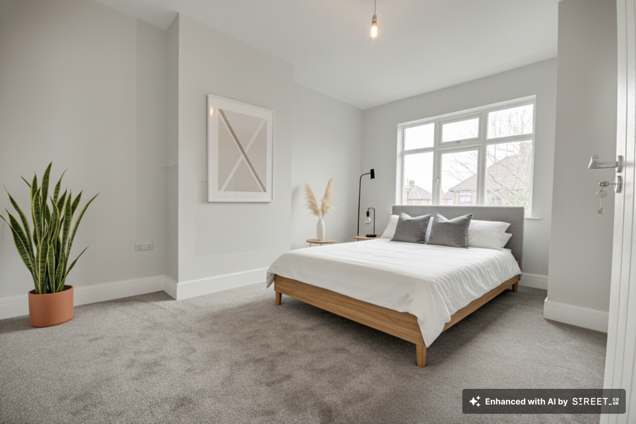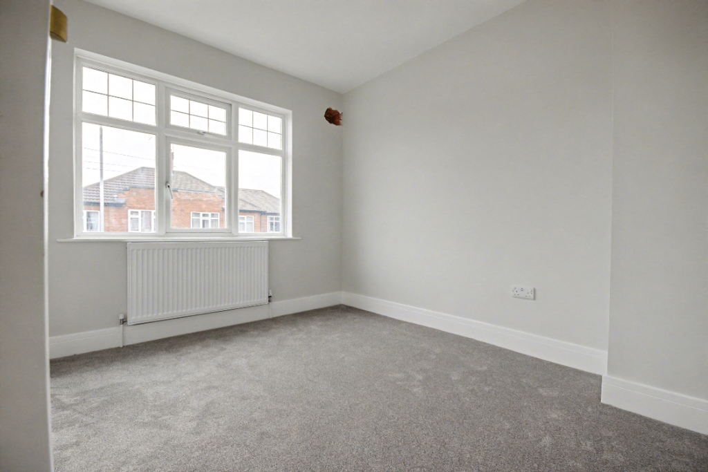 Another spacious double bedroom at the front of the property, also carpeted in soft grey. Virtual staging showcases how this room can function as a comfortable double bedroom with ample storage space.