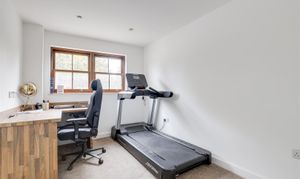 The study has a wood-framed sliding sash window, newly-fitted carpeted flooring, recessed spotlights, and a radiator.