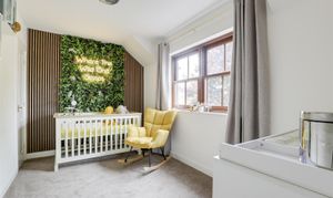 The third bedroom has a wood-framed sliding sash window, newly fitted carpeted flooring, an artificial greenery feature wall flanked by wooden slats either side, and a radiator.