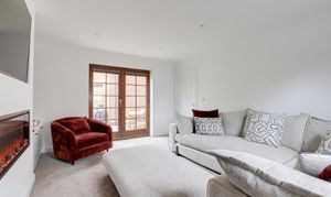 The living room has a wood-framed sliding sash window, newly fitted carpeted flooring, coving to the ceiling, recessed spotlights, a media wall featuring a wall-mounted TV point and a recessed flame-effect fire, wood slat feature walls, and wood-framed double doors opening out to the garden.
