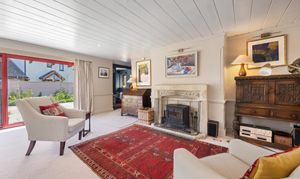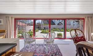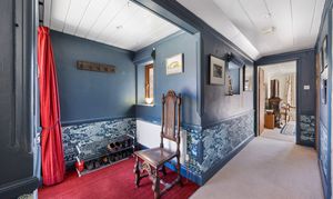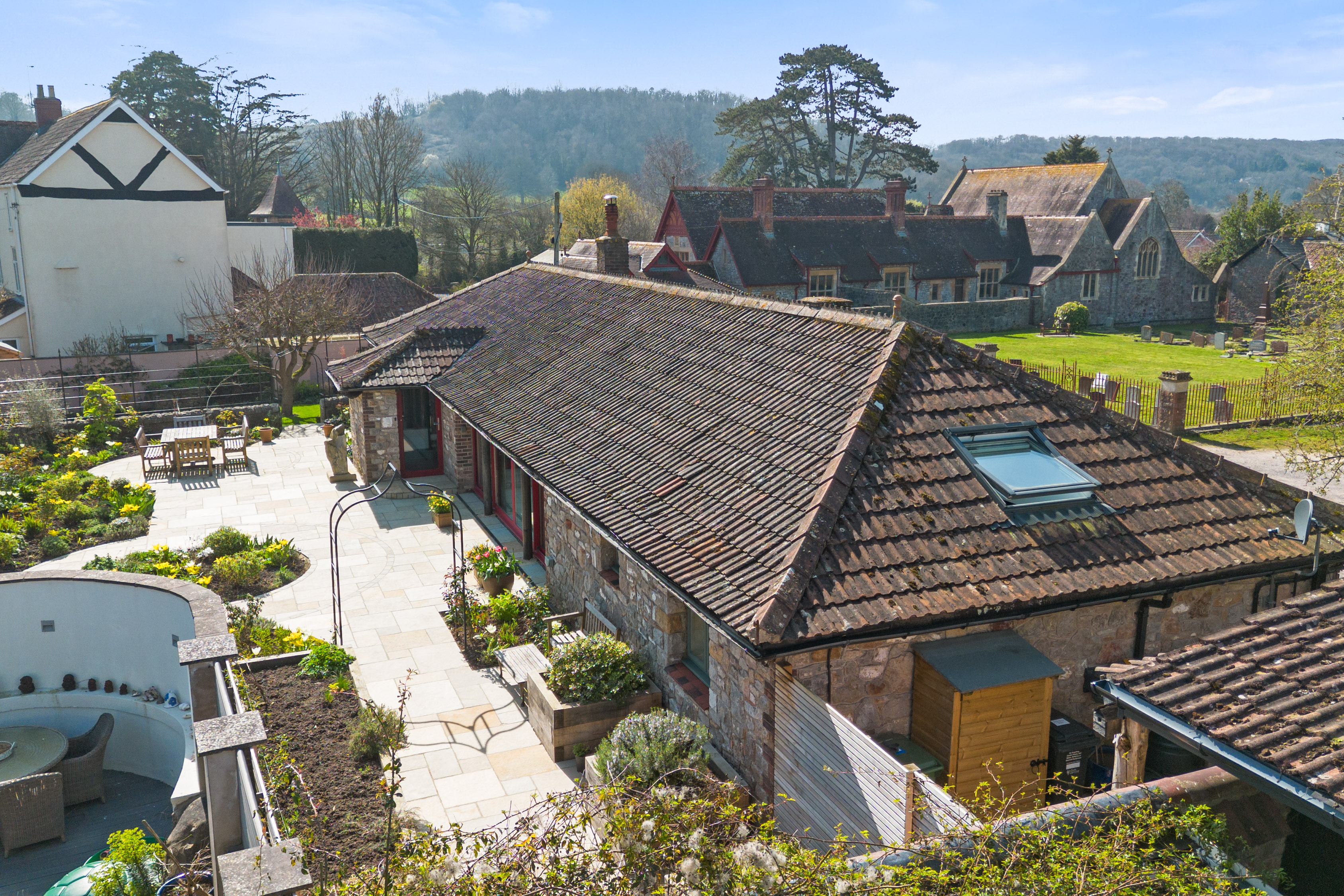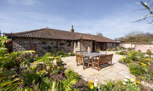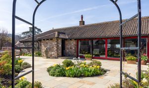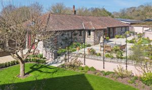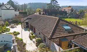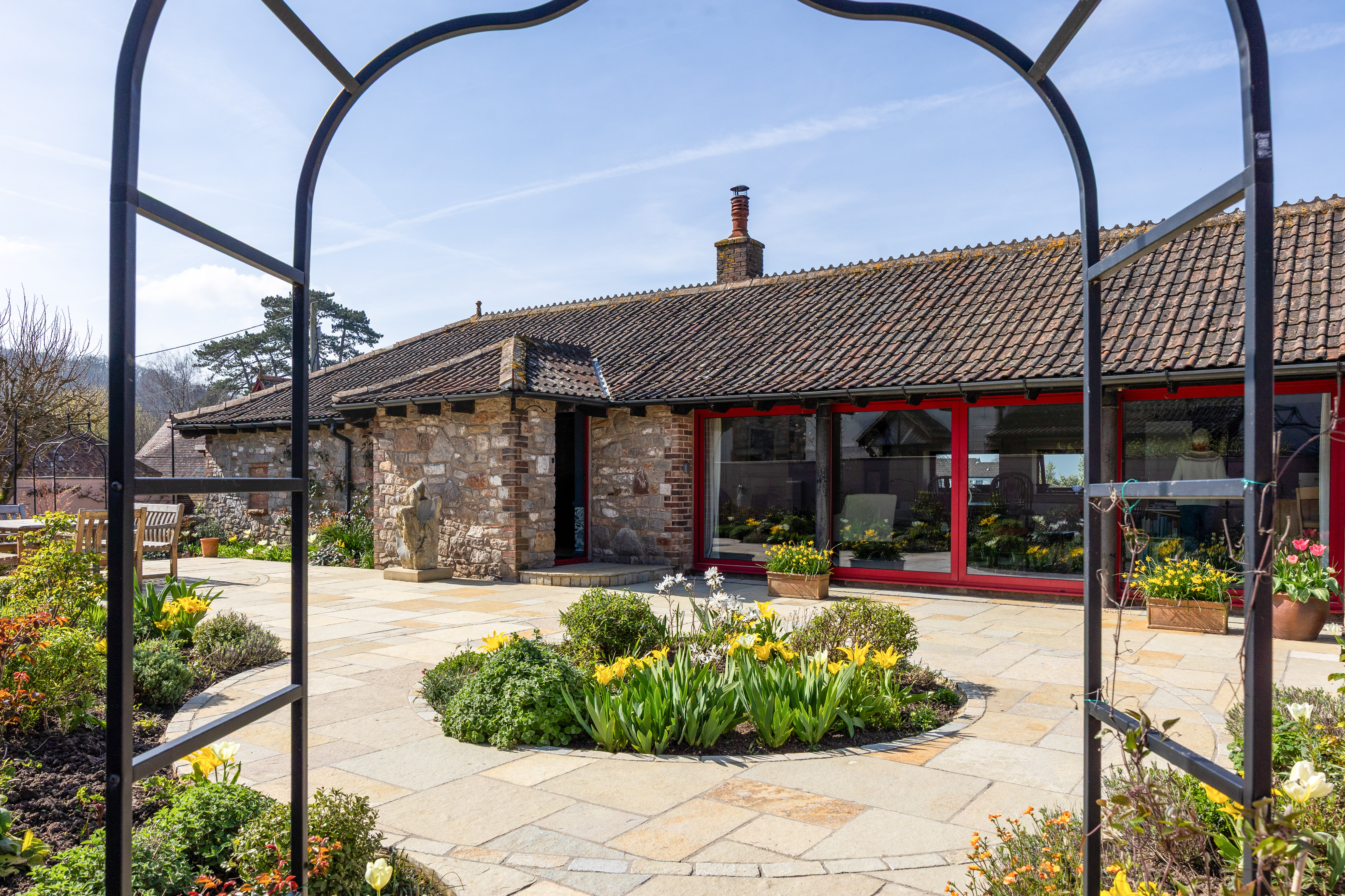 Long Barn is a beautifully presented detached stone barn approached via a long, winding driveway and set behind stone walls with impressive cast iron gates. The property enjoys a stunning, newly designed low-maintenance garden, created by The Hegarty Webber Partnership and built by Your English Garden in 2024. Thoughtfully landscaped, the garden features elegant stone boundaries, generous paving and flowing planter beds with soft, natural contours. One of the most striking features of the property is the glass frontage: floor-to-ceiling, bold red aluminium-framed sliding doors with glass panels on either side, create a modern contrast to the original stone walls, and allow an abundance of natural light to fill the interior. The property is beautifully finished throughout, with features that include bespoke curtains to the glass front.