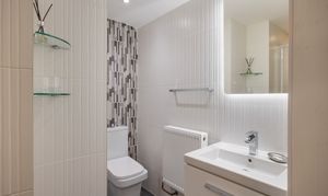 The accommodation includes two double bedrooms, both with en-suite bathrooms. The principal bedroom benefits from fitted wardrobes, air conditioning, and an en-suite bathroom featuring a bath with overhead shower. The second bedroom also enjoys its own en-suite shower room, finished with contemporary fittings and decorative detailing. There is another separate WC off the hallway.