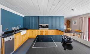 - Open-plan kitchen, dining and living area with wood-burning stove