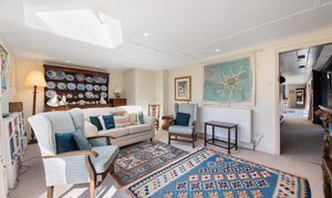 To the left, a secondary reception space with fully glazed French windows and large, remote-controlled Velux skylight windows with in-built blinds allows further natural light to flood the room.