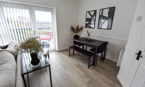 Large lounge dining room with floor to ceiling windows and sliding patio door to Juliet veranda. Designated lounging and dining area. Quality laminated flooring.
