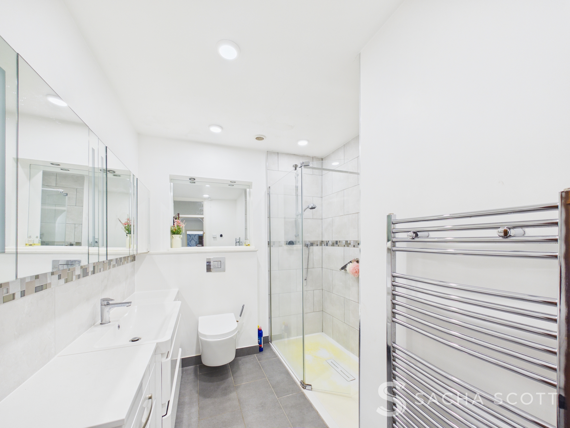 The en-suite is fully tiled and features a large shower enclosure, a combination WC and sink unit with built-in storage, a mirrored wall cabinet and a heated towel rail.