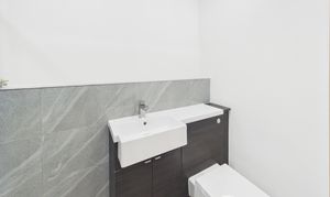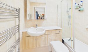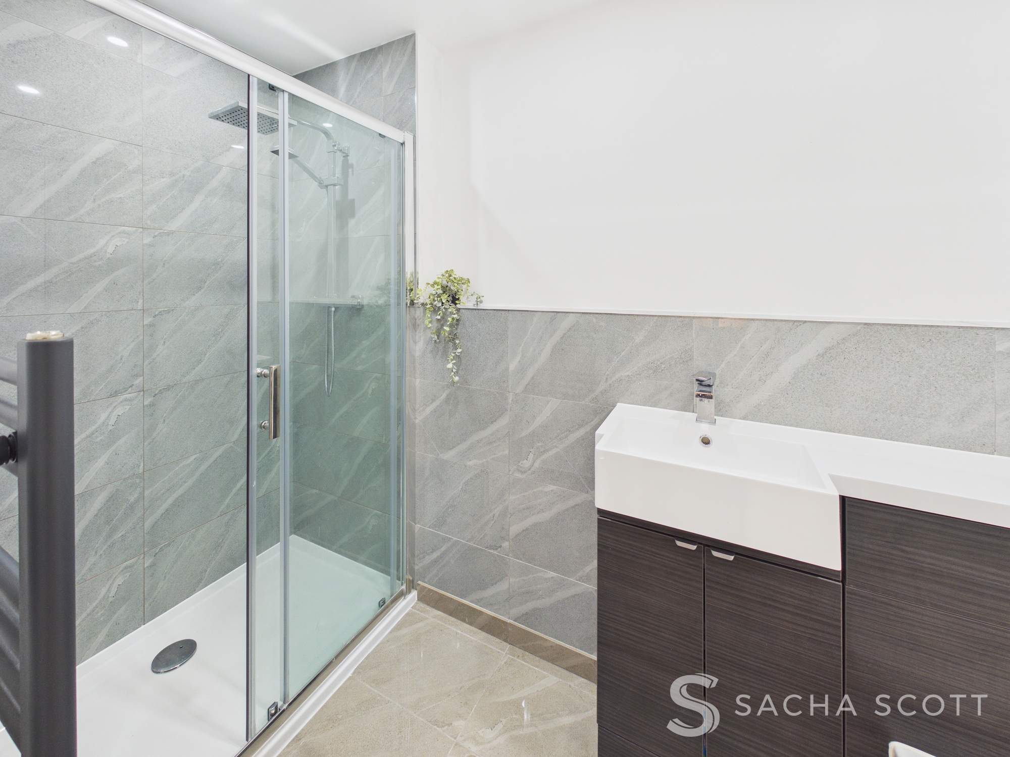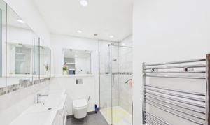Located off of the main entrance hall, the family bathroom is neutrally presented and offers a modern sink unit with storage, a WC, generous shower enclosure and heated towel rail.