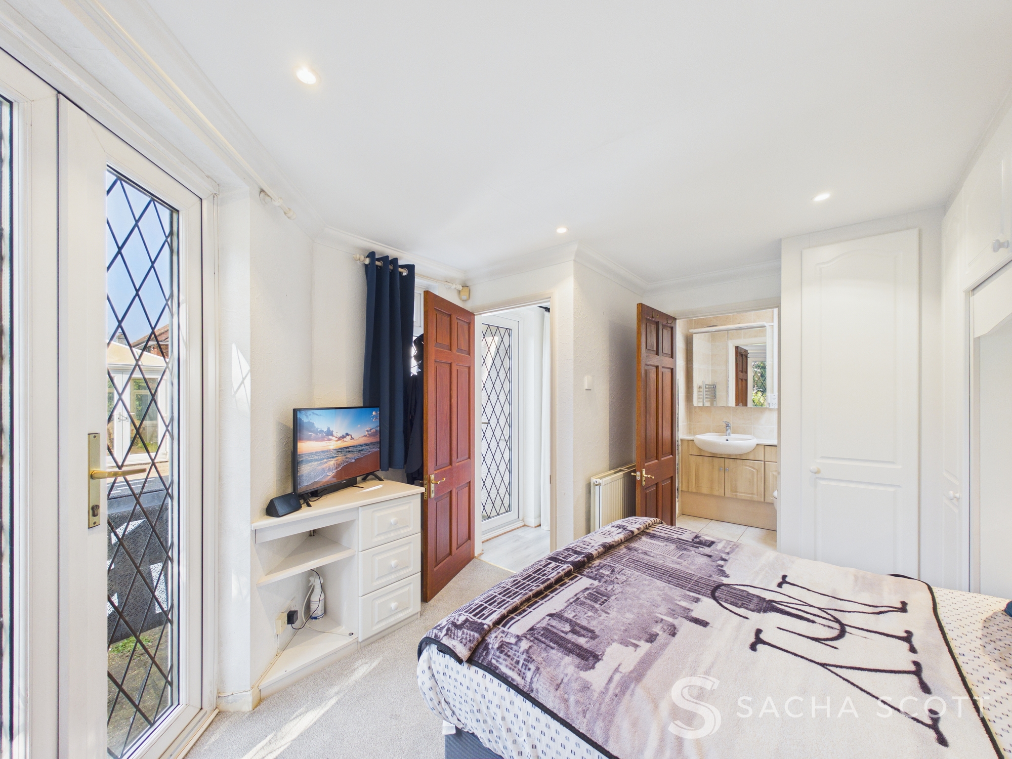 Neutrally presented and filled with natural light from patio doors opening onto the garden, the primary bedroom enjoys a lovely outlook over the rear garden and benefits from fitted wardrobes and an en-suite shower room.