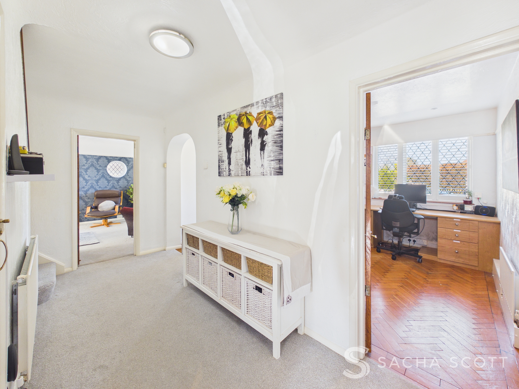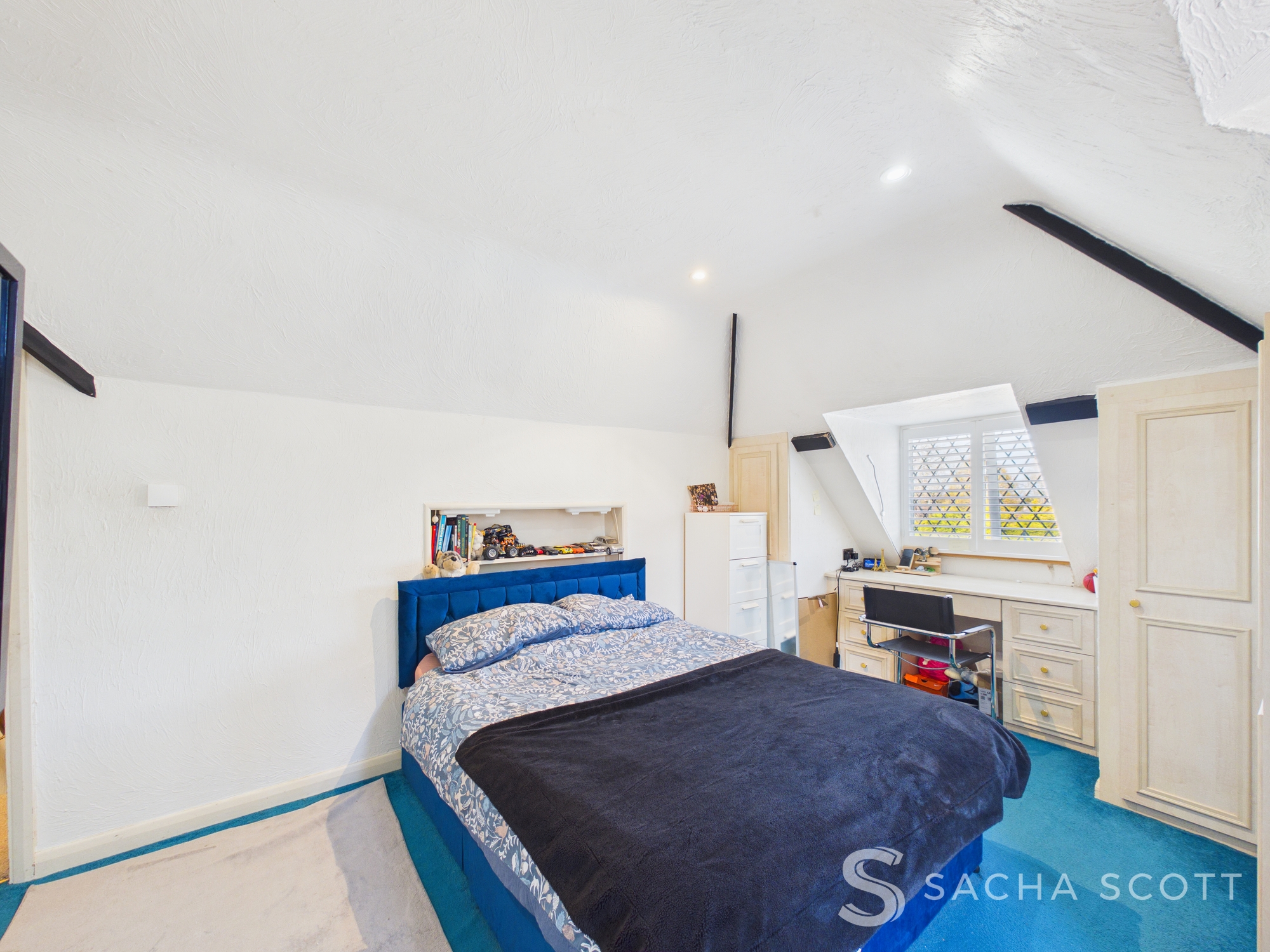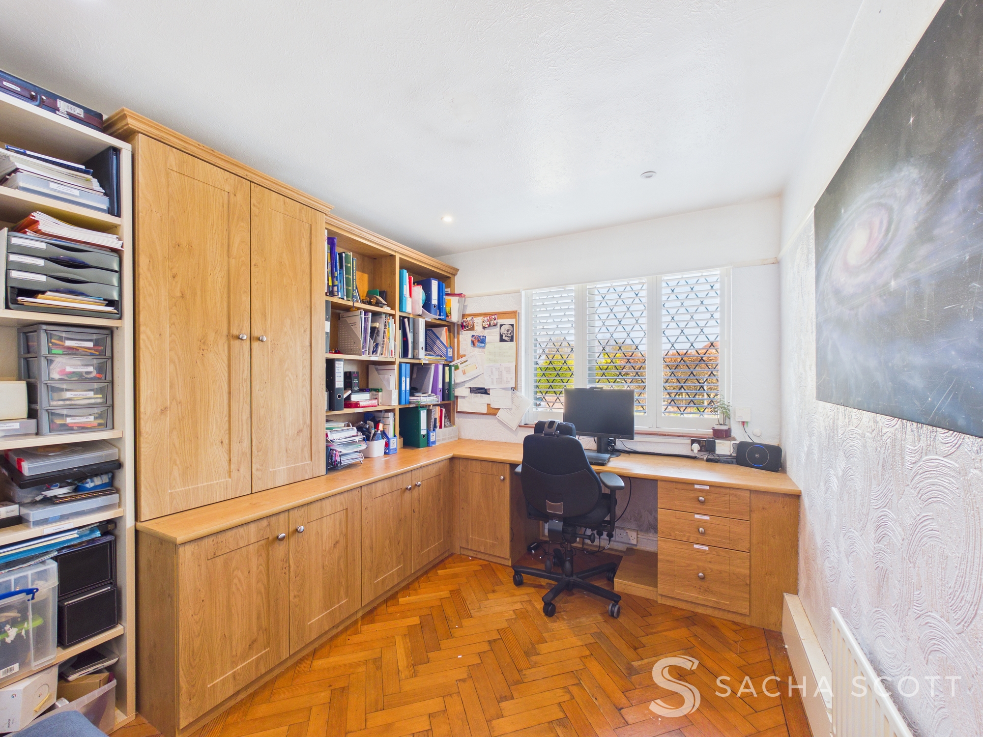 Bedroom 4 is currently used as a home office. Benefiting from neutral decor and stunning herringbone flooring, this good sized single overlooks the front of this substantial chalet bungalow.