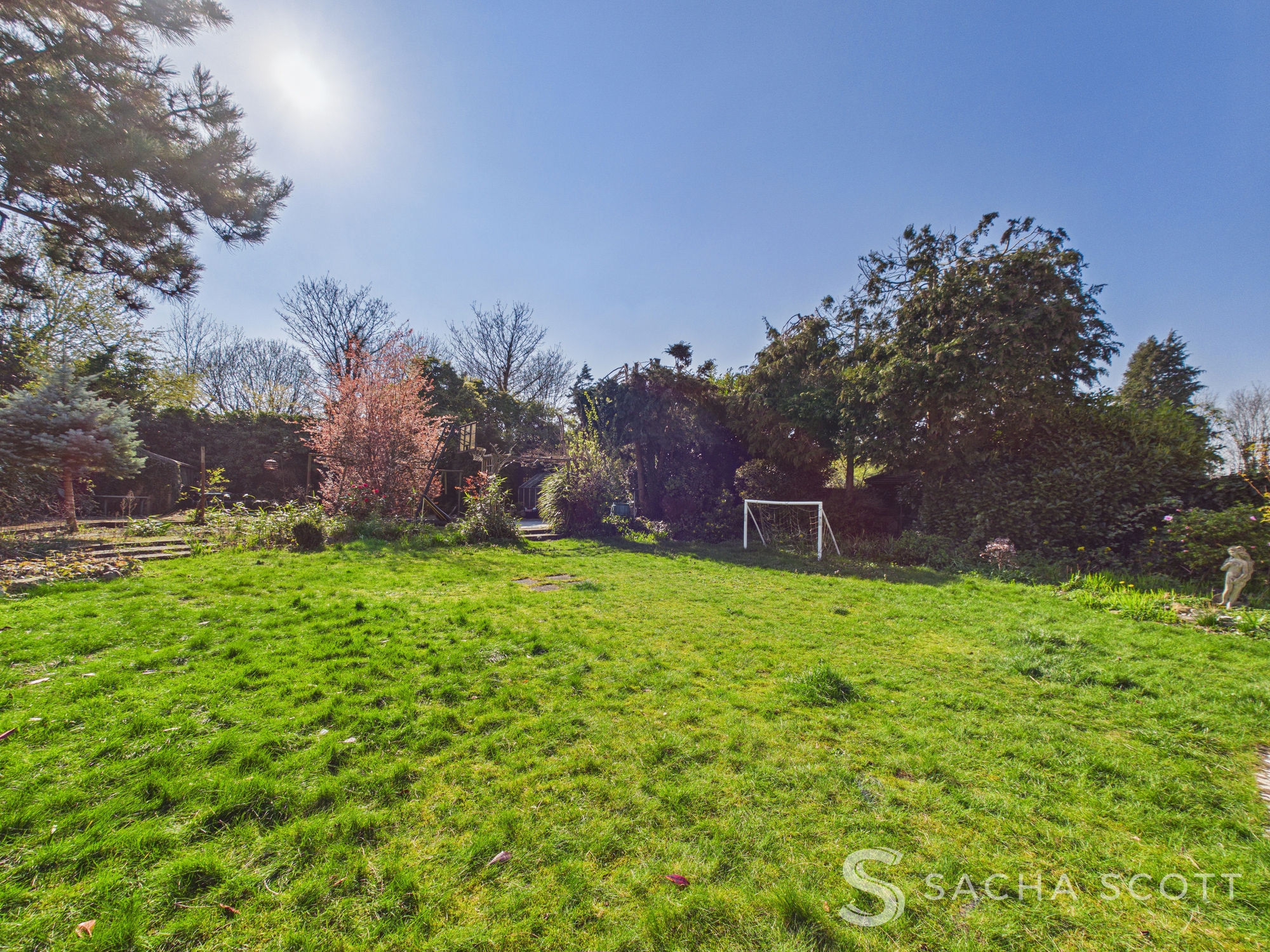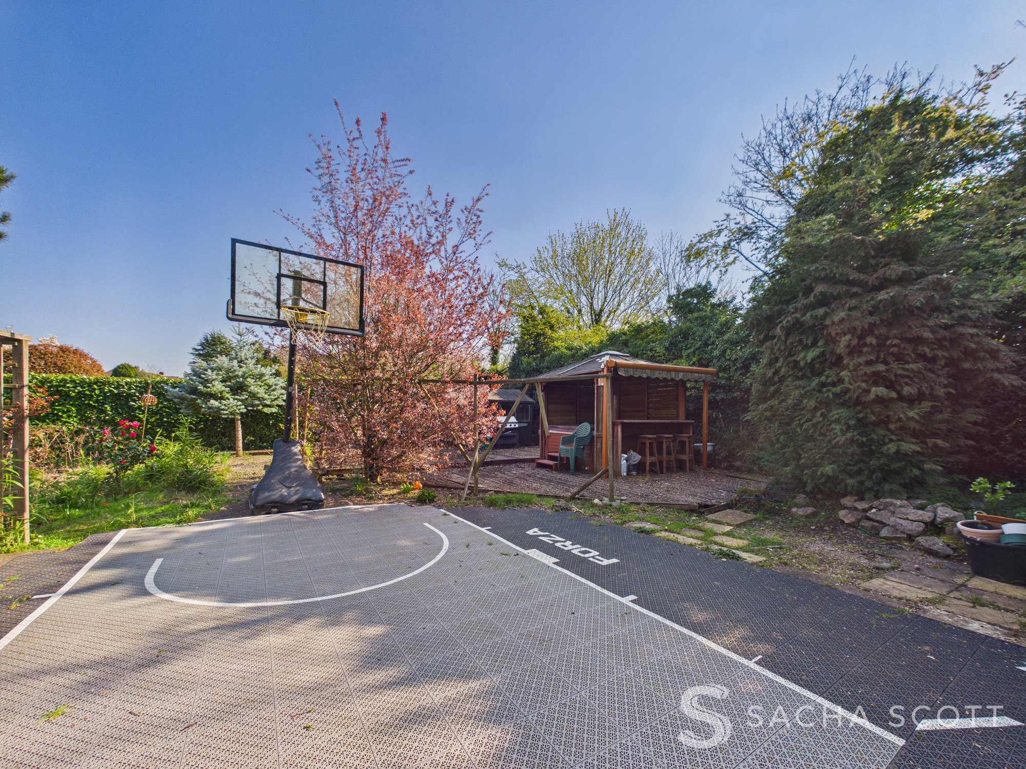 The rear garden enjoys a desirable south west facing aspect and is thoughtfully arranged, with a large patio perfect for entertaining, opening onto a well-kept lawn and extending to a decked seating area with a small playground court, ideal for families.