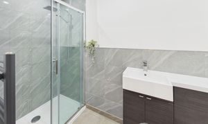 The en-suite is modern in style and part tiled, featuring a large shower enclosure, a combination sink and WC unit with built-in storage, and a ladder-style heated towel rail.