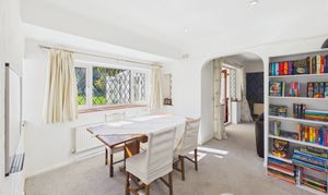 Neutrally presented, the dining room is ideally positioned between the living room and kitchen, with a picture window framing views over the mature rear garden.
