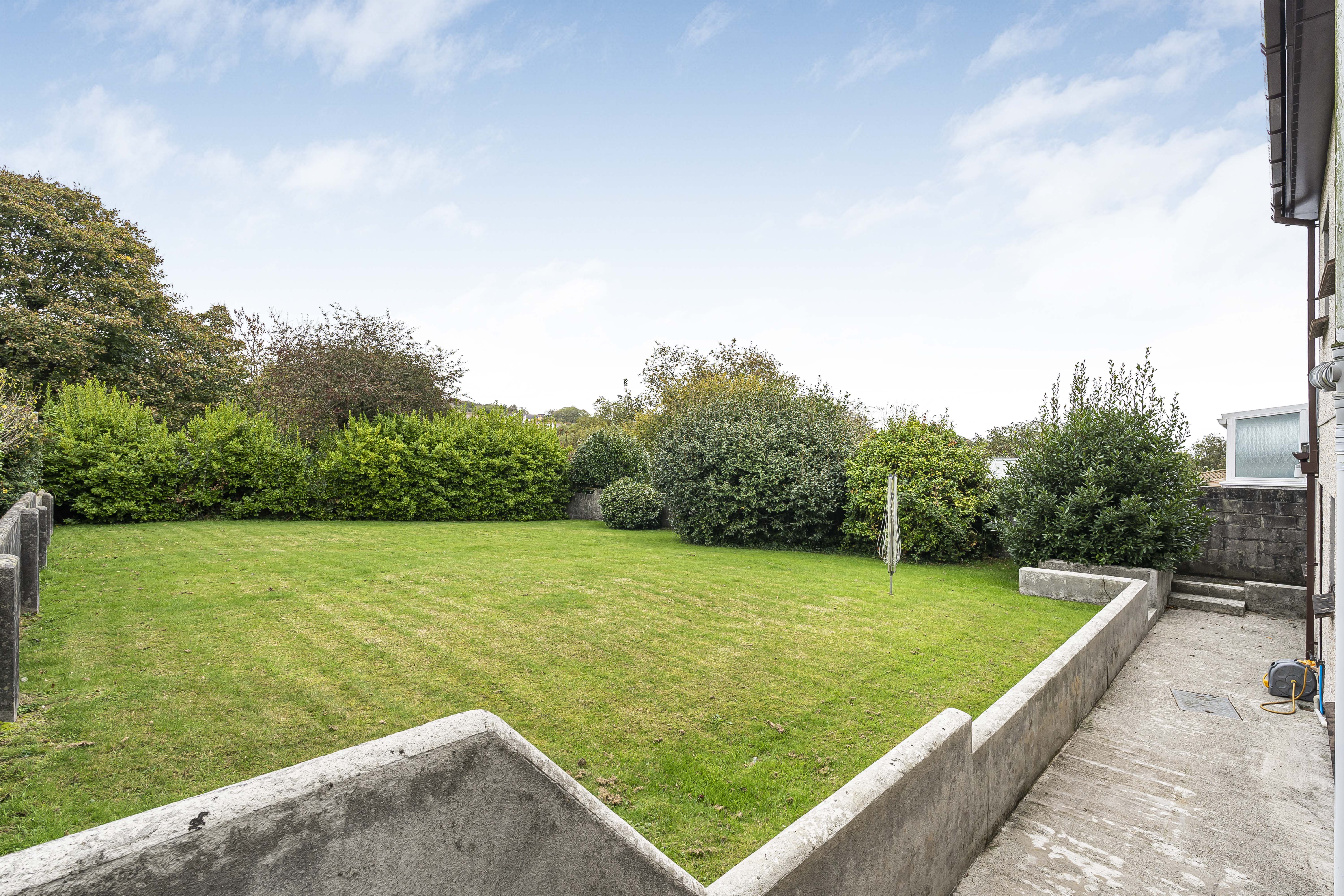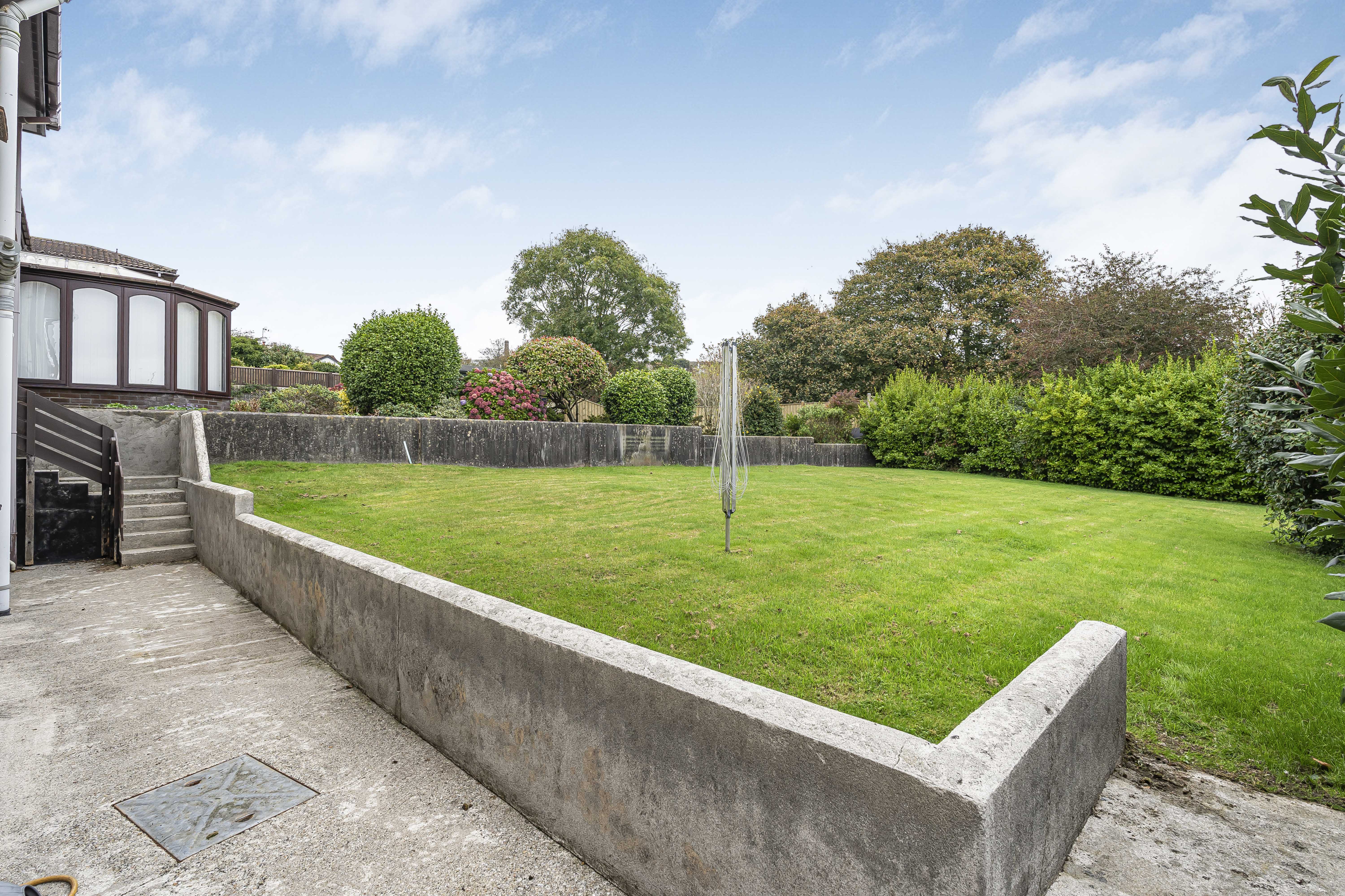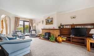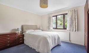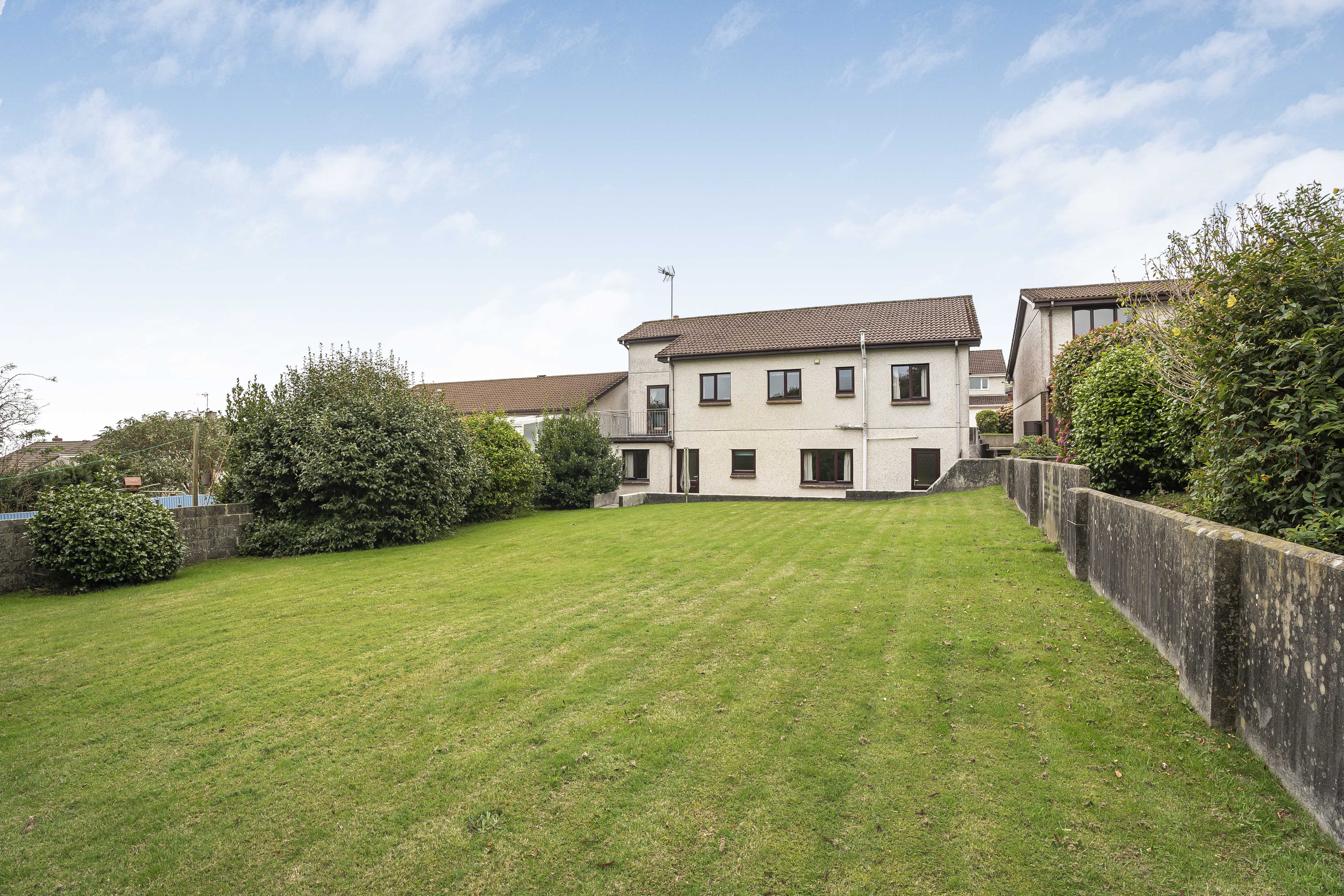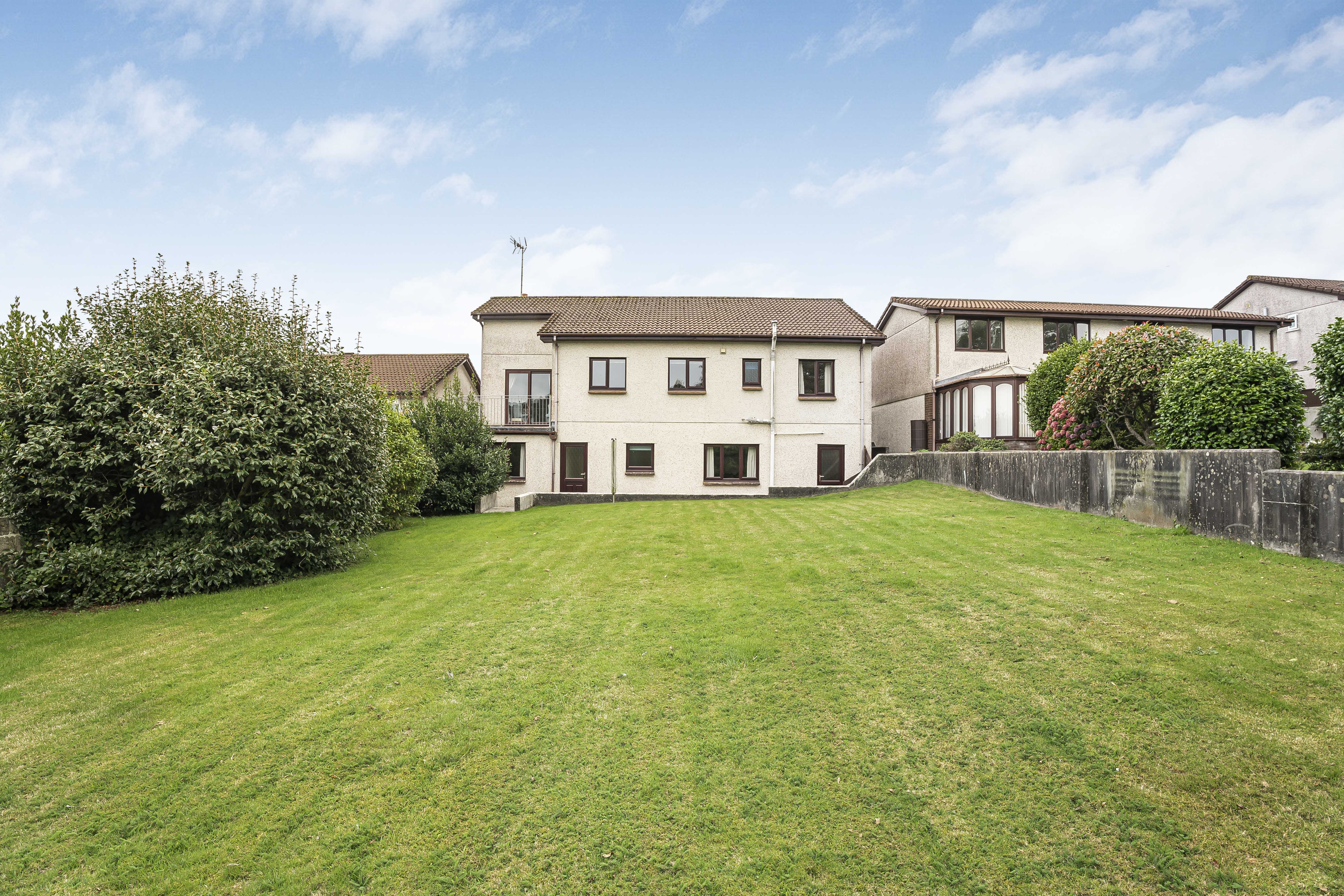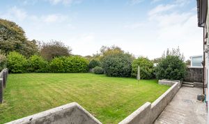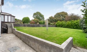 The rear garden is level, with an expansive lawn, hardstanding area, and pathway. Established shrubs and trees to the borders, enclosed with fencing.