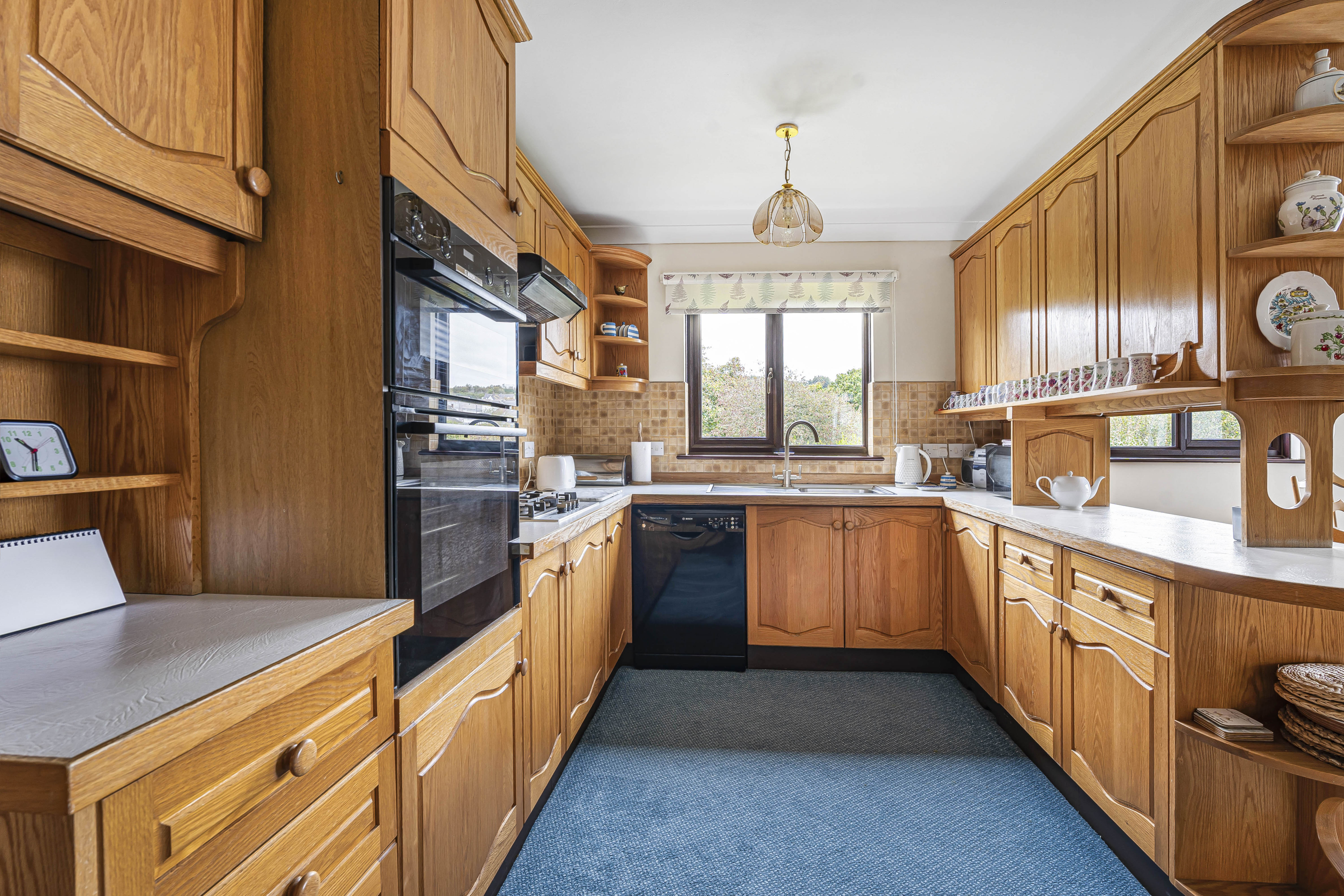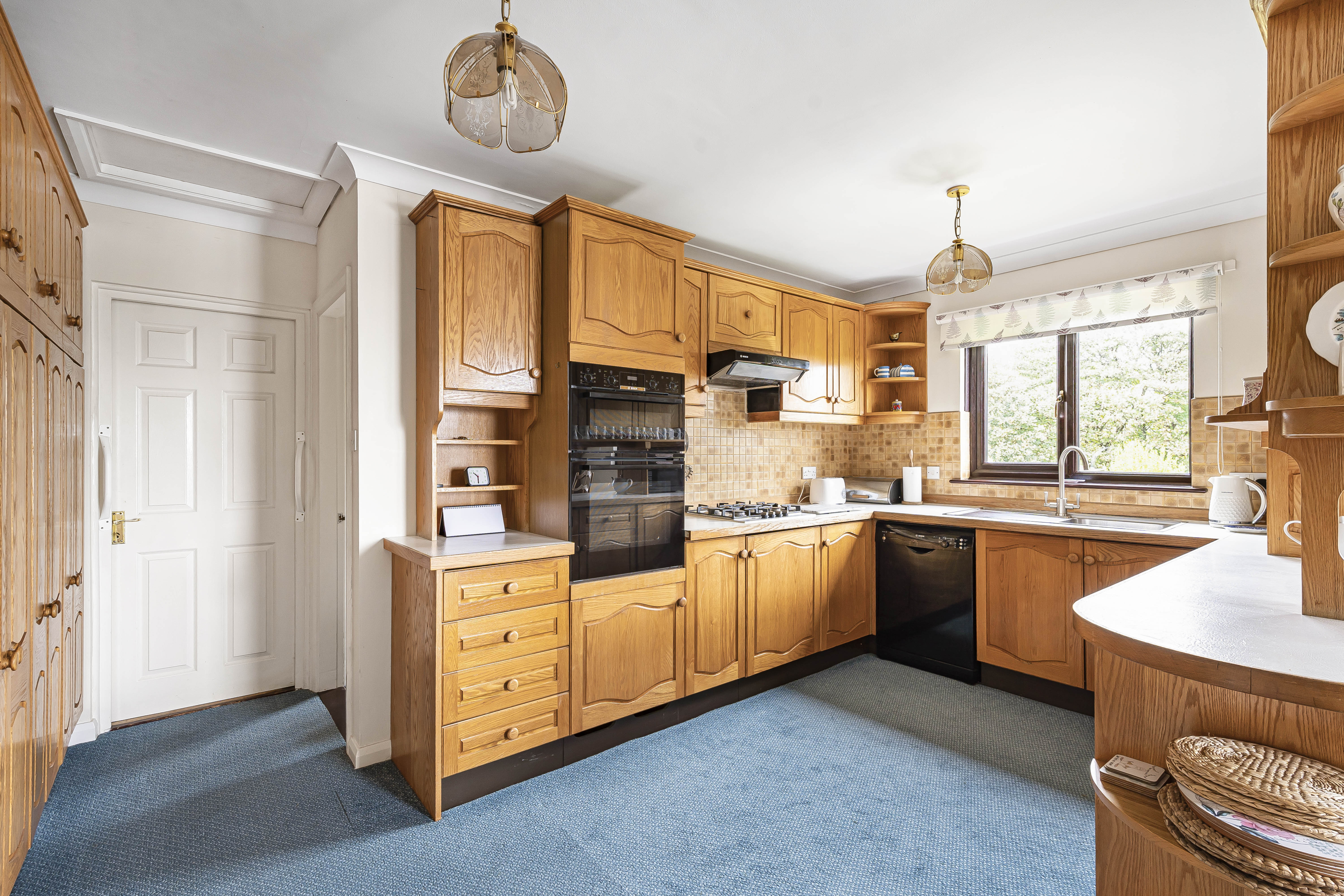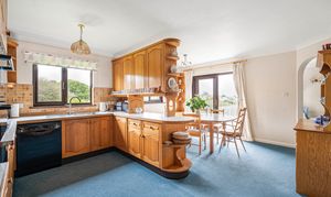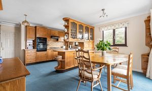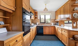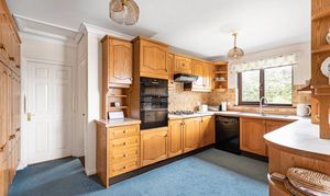 The kitchen offers a range of solid wooden base and wall units, worktops over, built in oven and hob with extractor over, space for dishwasher and integrated fridge/freezer.