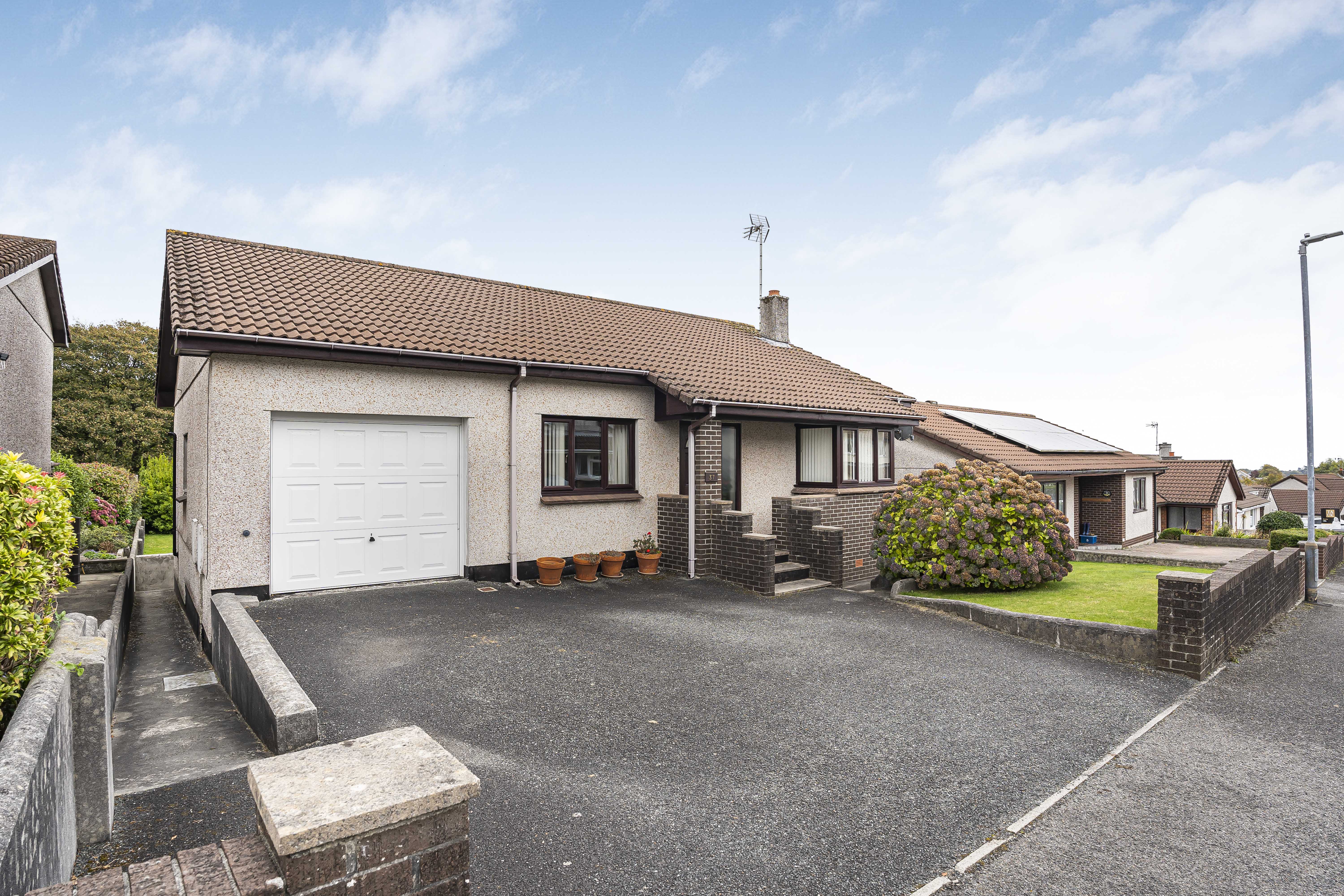 The property has a garage with automatic door opening, utility area which can also be accessed from kitchen, with sink area and plumbing for washing machine and space for tumble drier. To the front parking for two vehicles. There is side access with steps down to the rear garden.