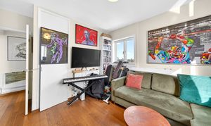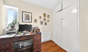 The dual aspect reception room is a good size and further benefits from built-in storage.