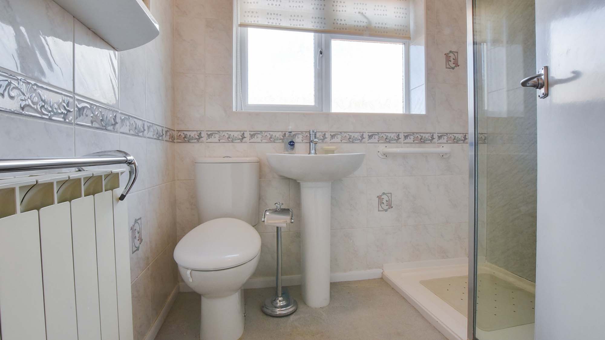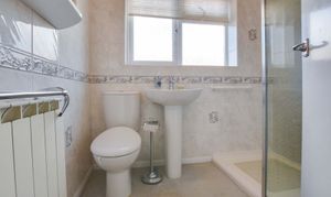 With a window to the side elevation, a double shower cubicle with a shower over, WC, and a wash hand basin.