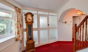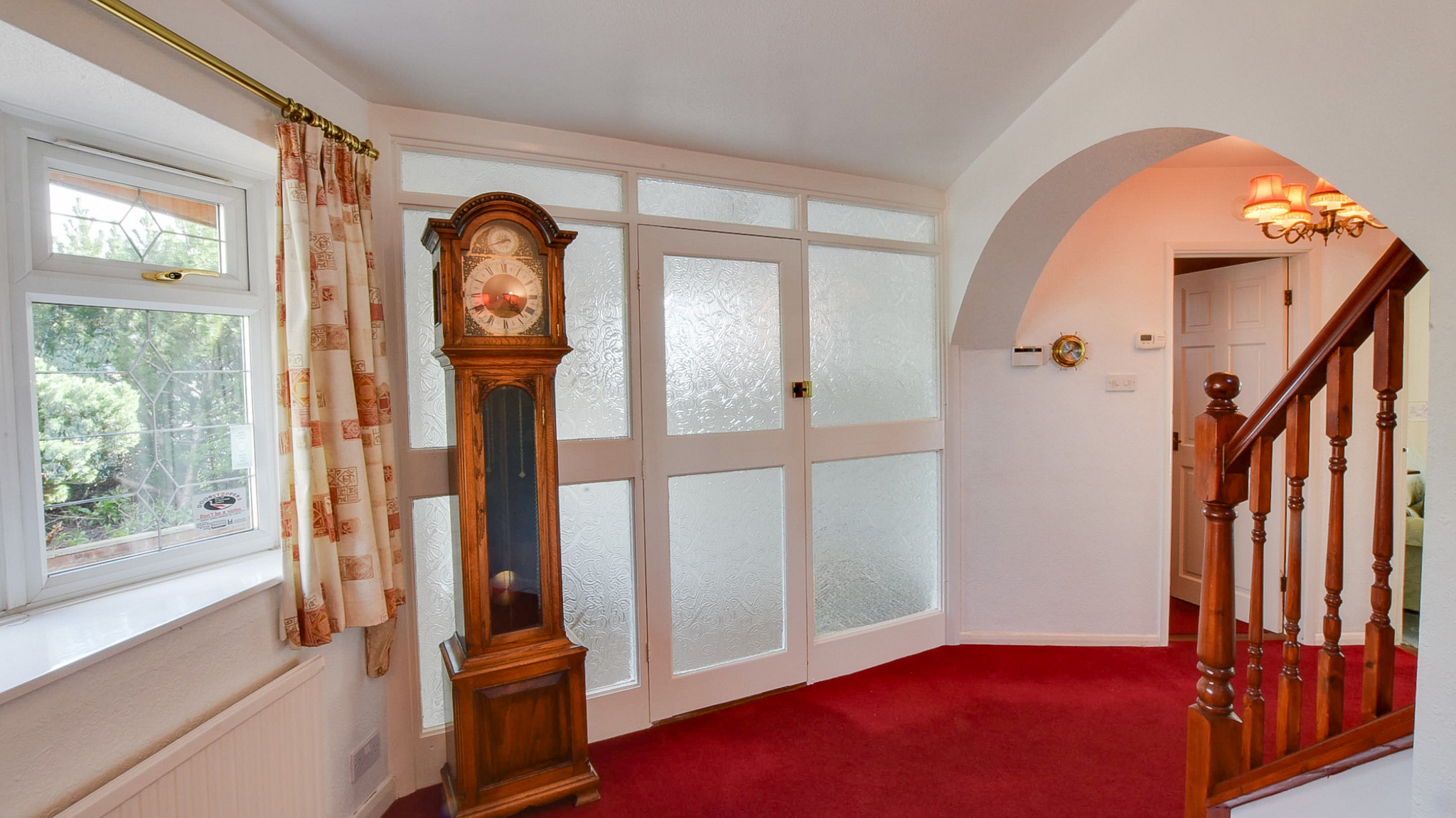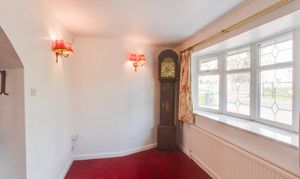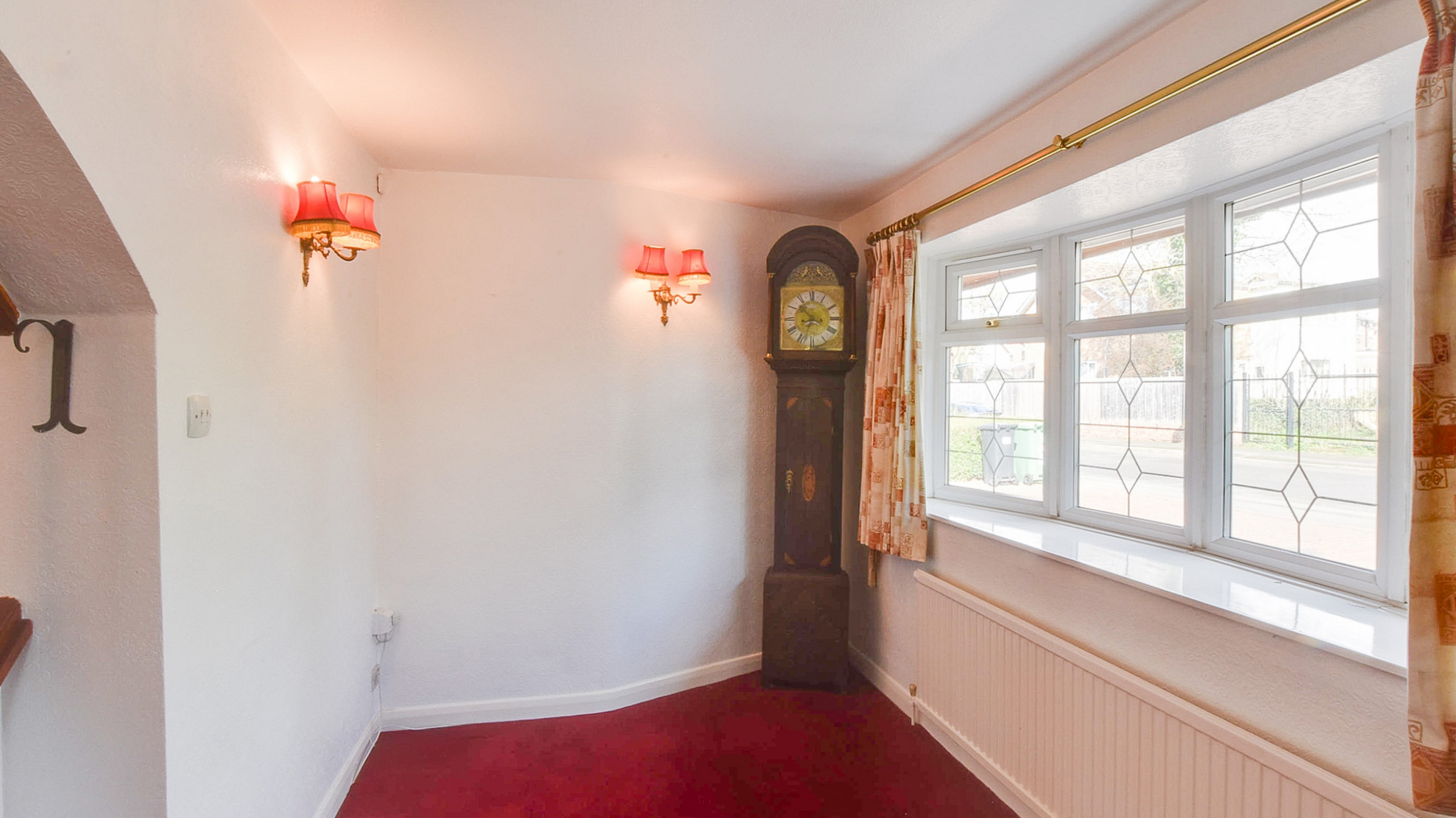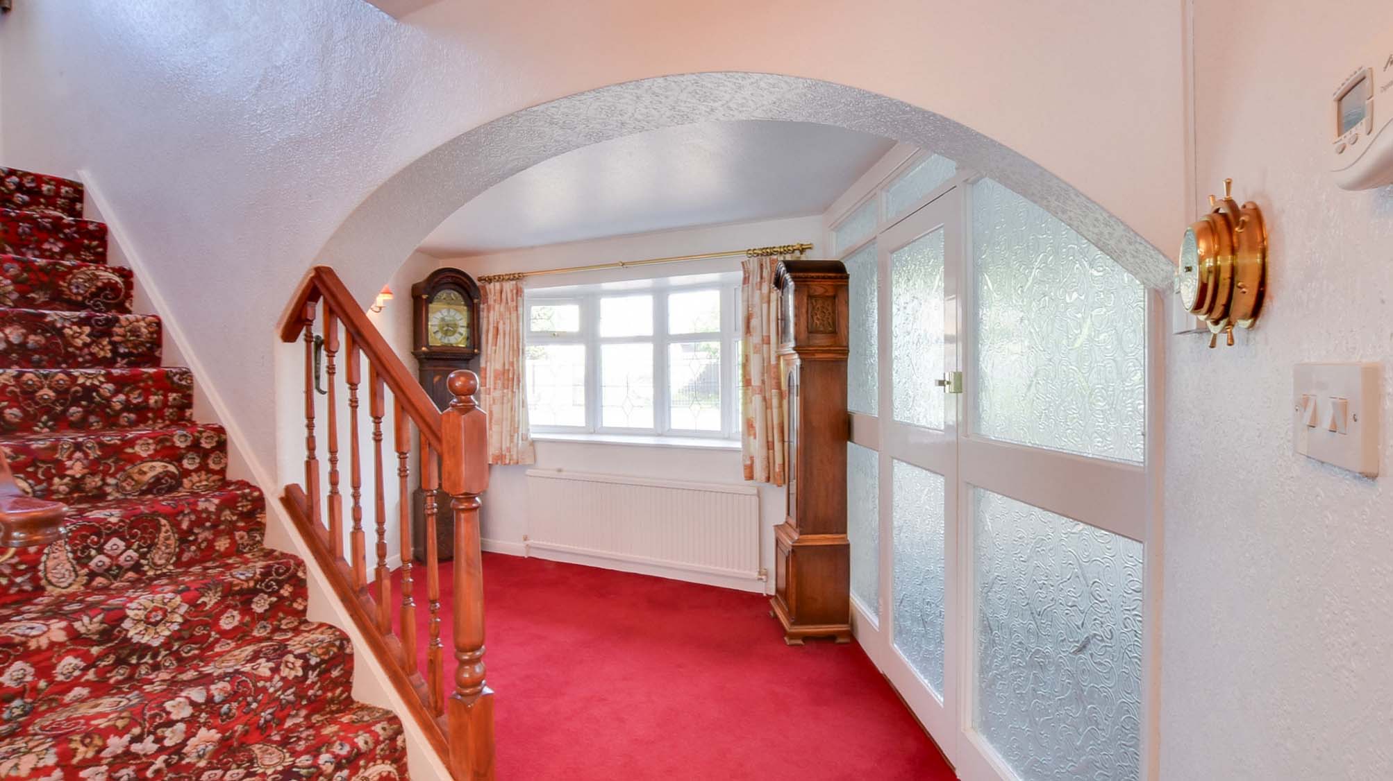 Contains a bay window, stairs to the first-floor landing, an archway, carpeting and two radiators.