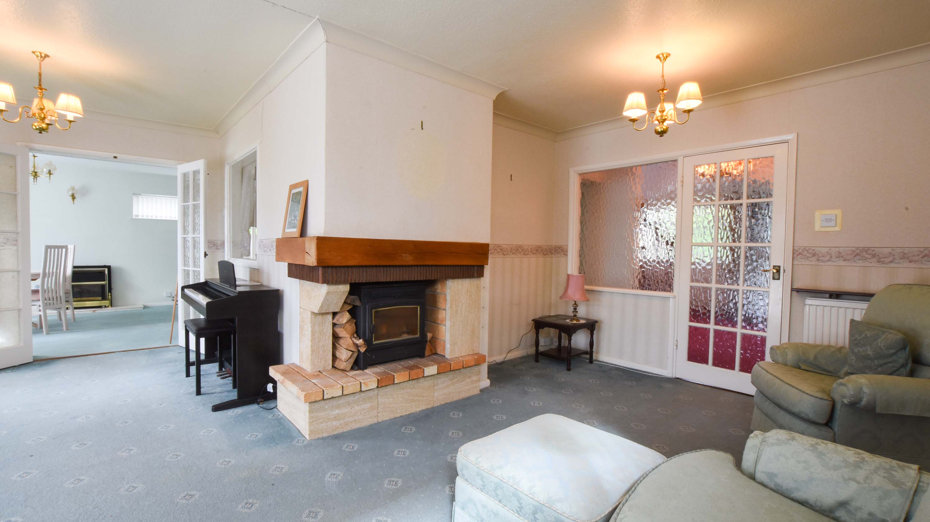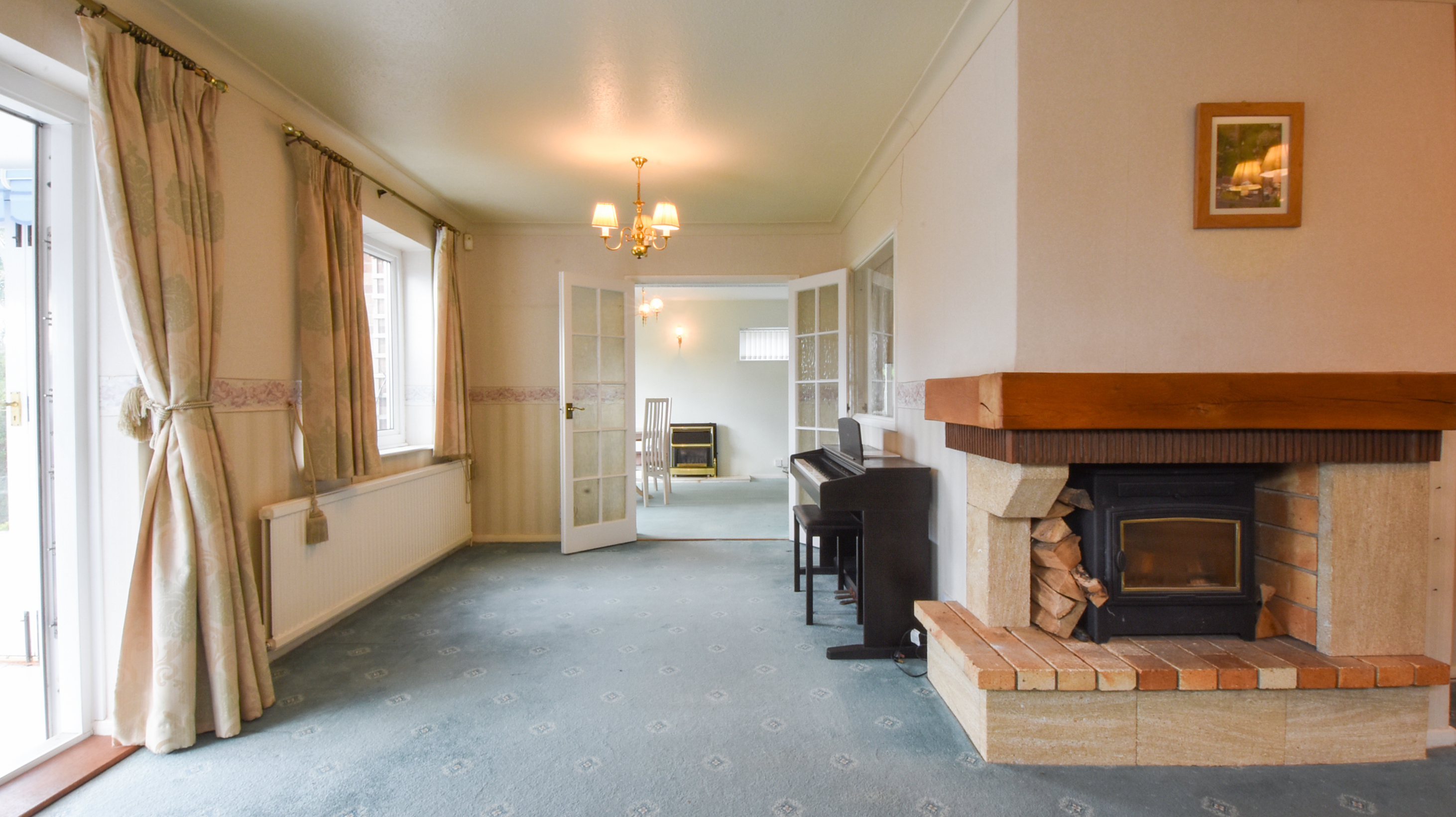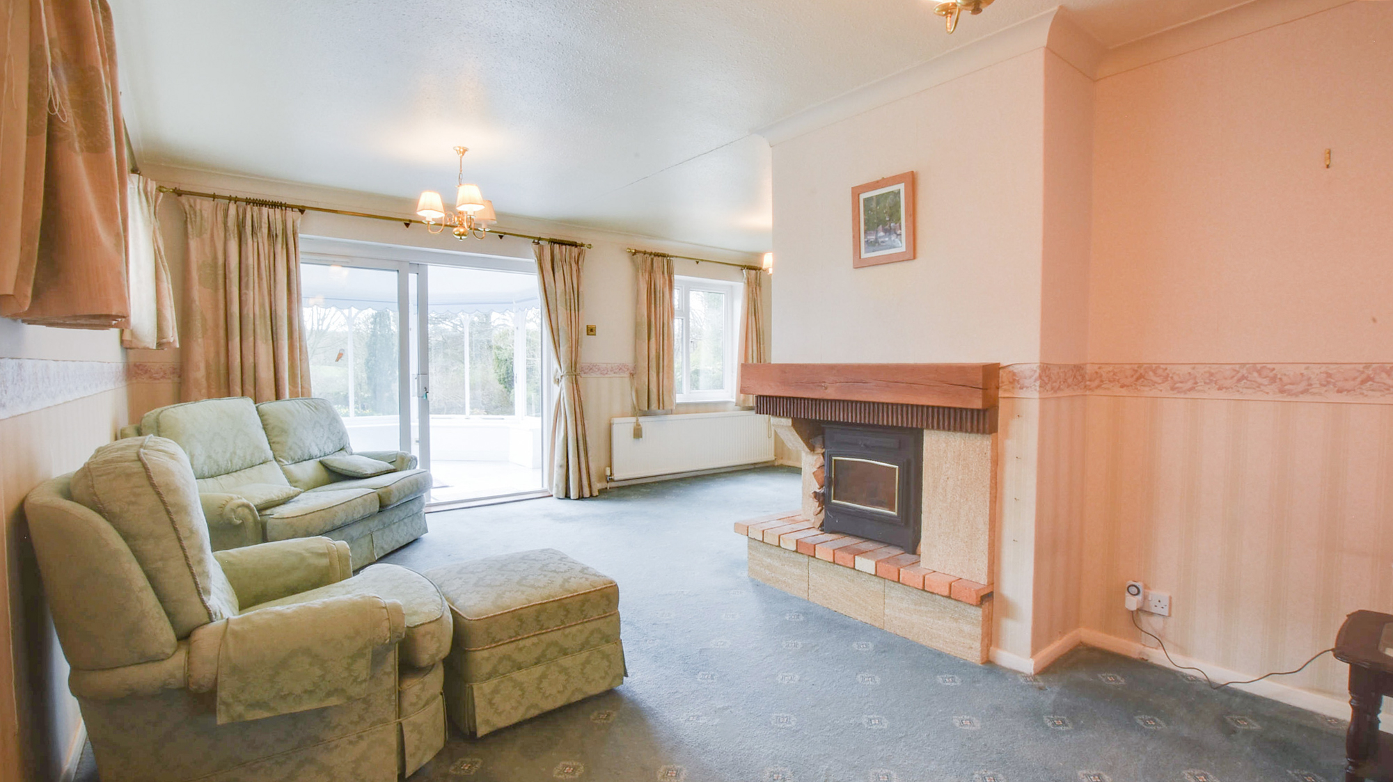 With a window to the rear elevation, a log burner, patio doors to the conservatory, and two radiators.
