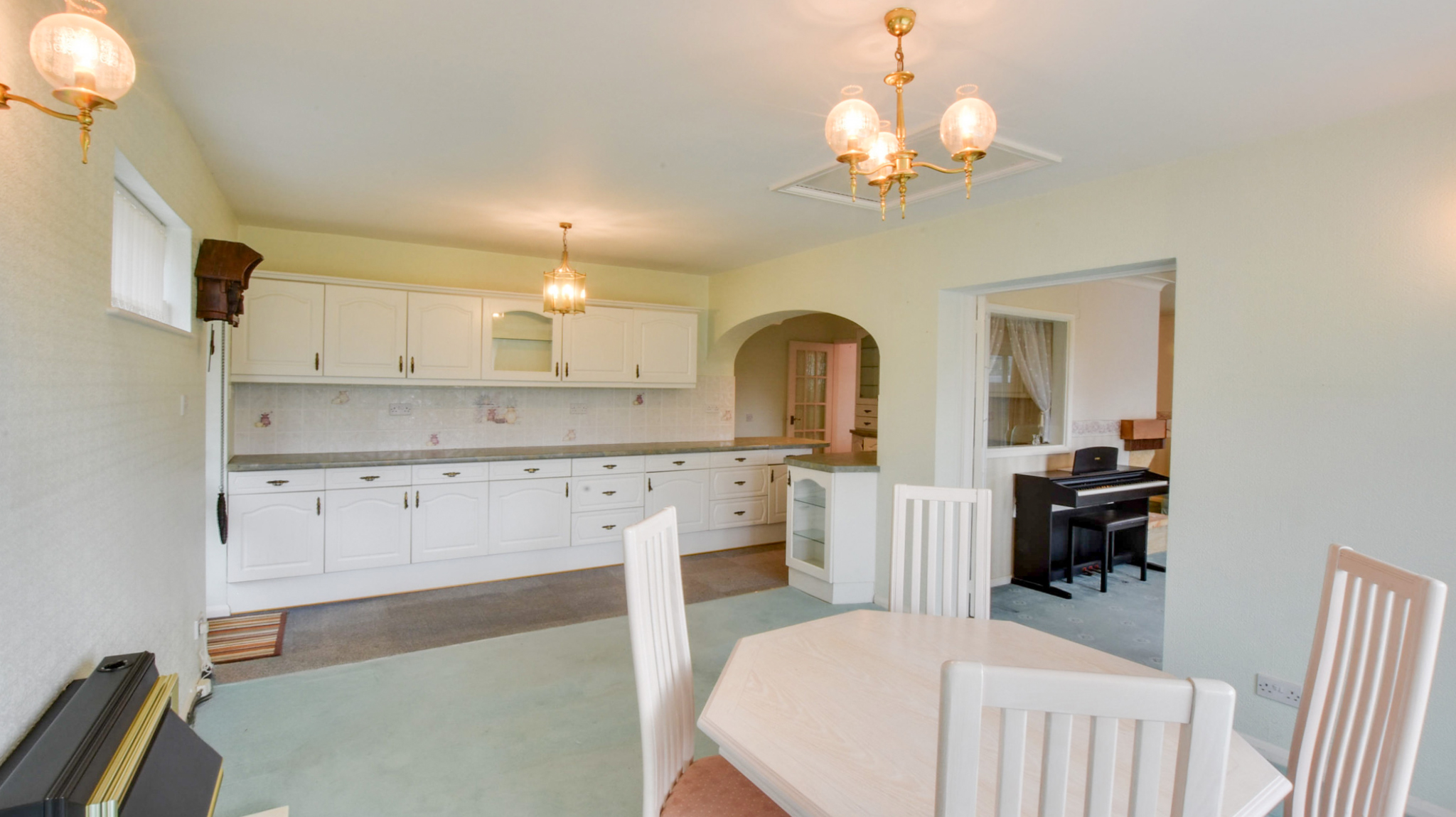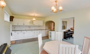 The dining kitchen is positioned to the rear of the property and offers a range of fitted units, work surfaces, and space for appliances. There is also a gas fire, a door to the side elevation, and internal access through to the garage. A downstairs WC completes the ground floor accommodation.