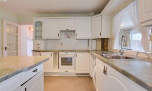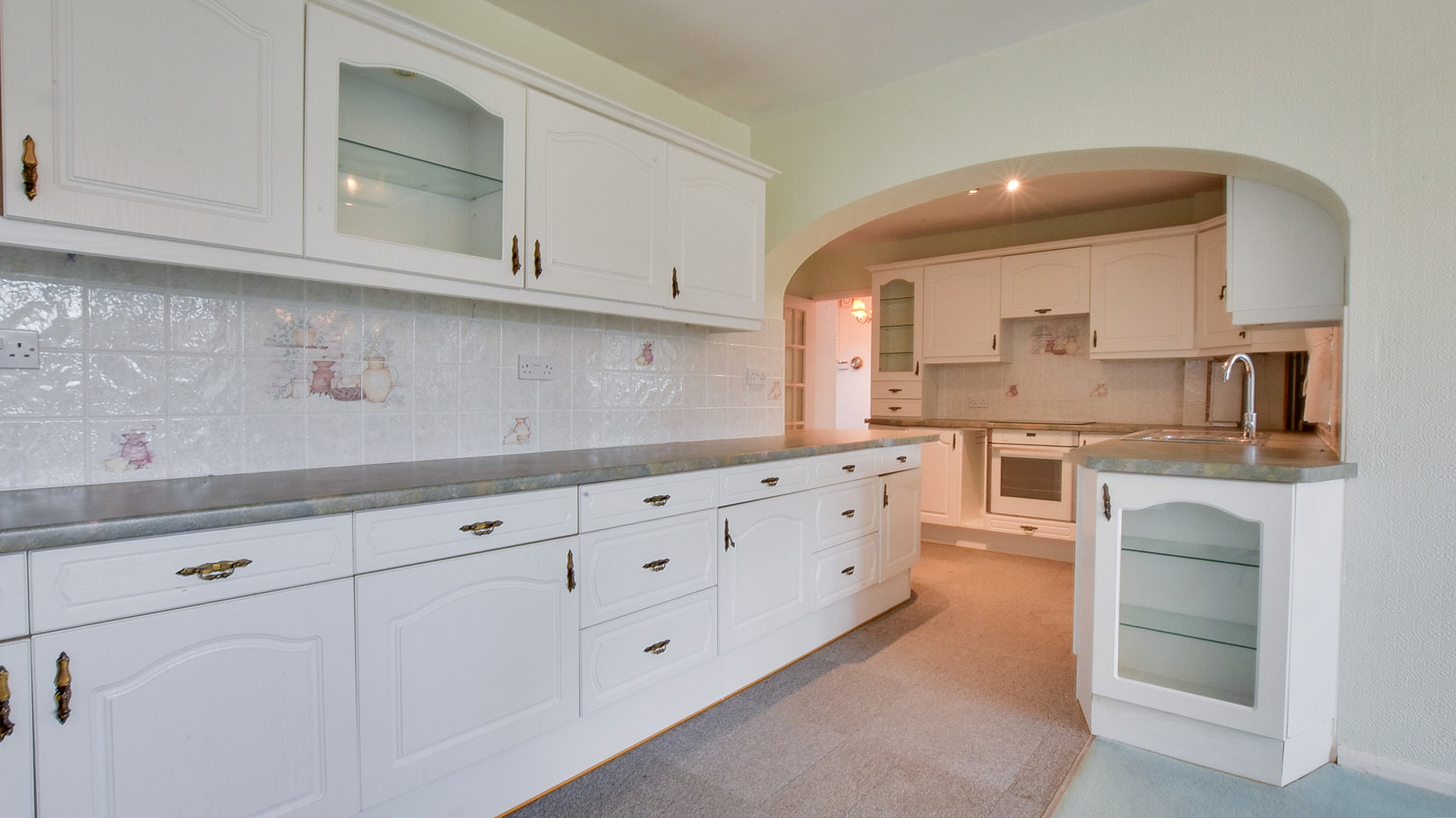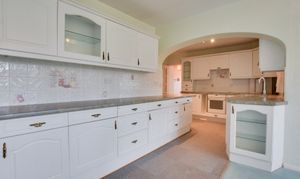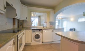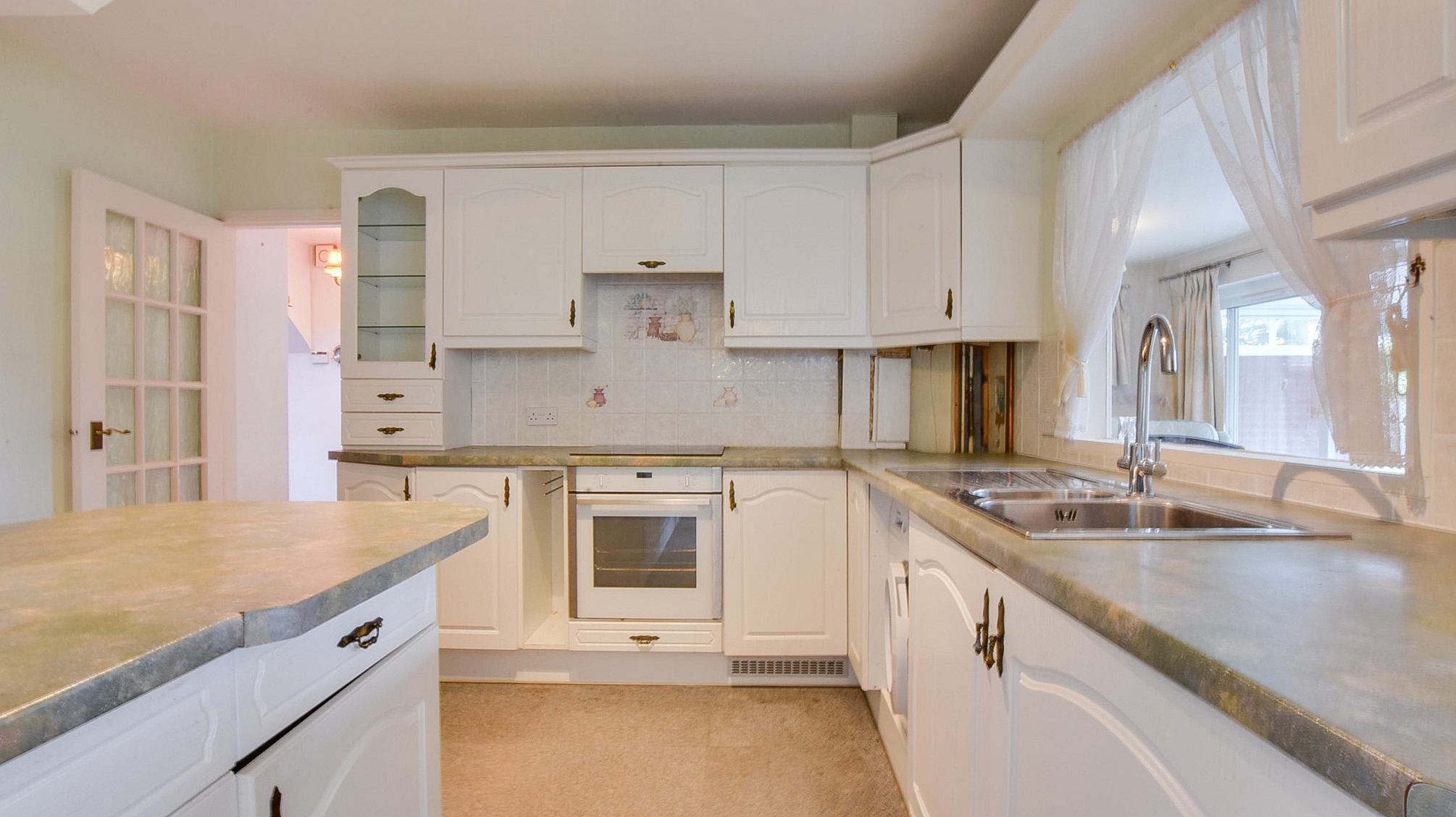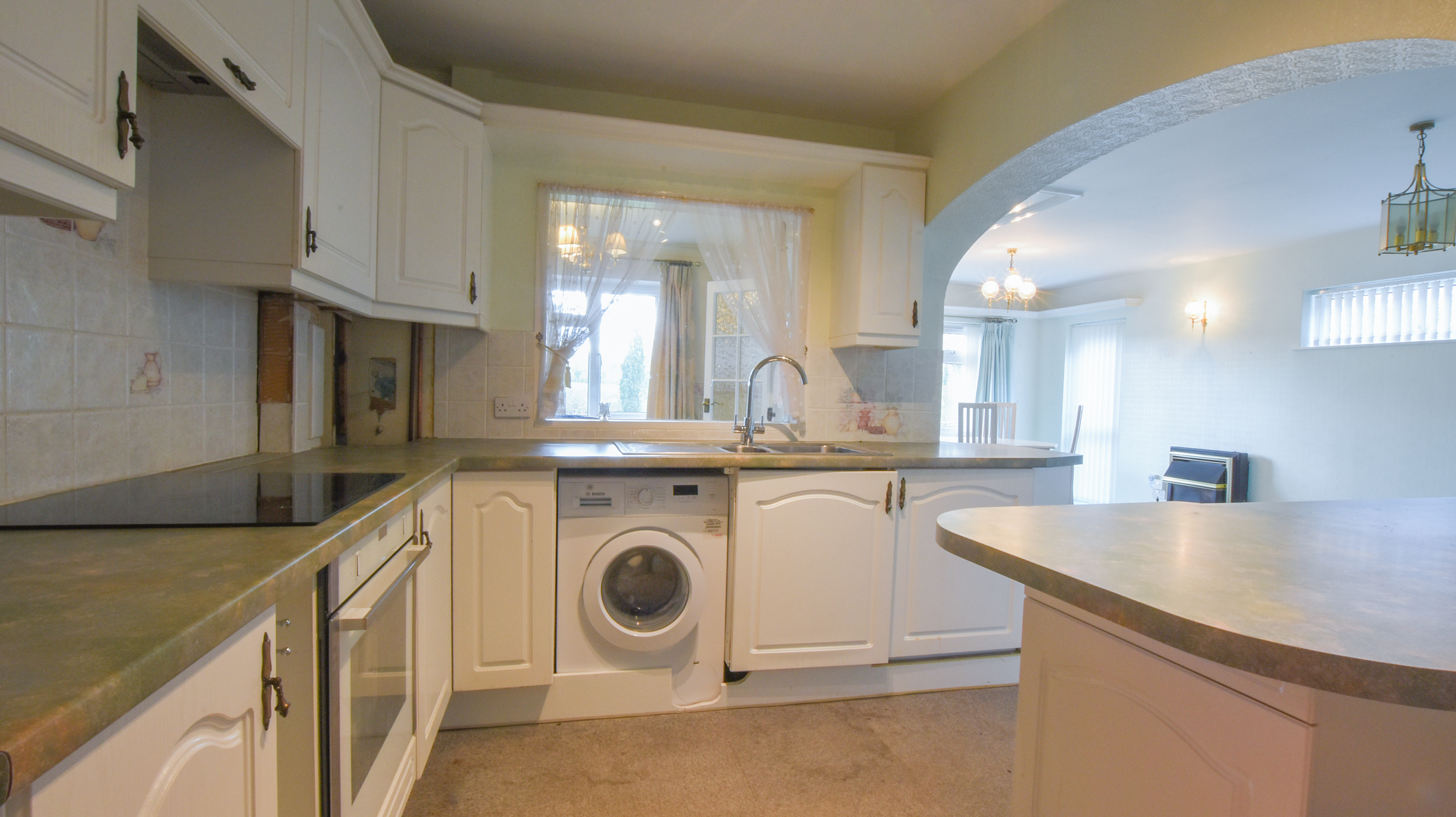 With a double-glazed window to the rear elevation, a sink and drainer unit with a range of wall and base units with work surfaces over, a dishwasher, a washing machine, an oven, a hob and a door to the garage.