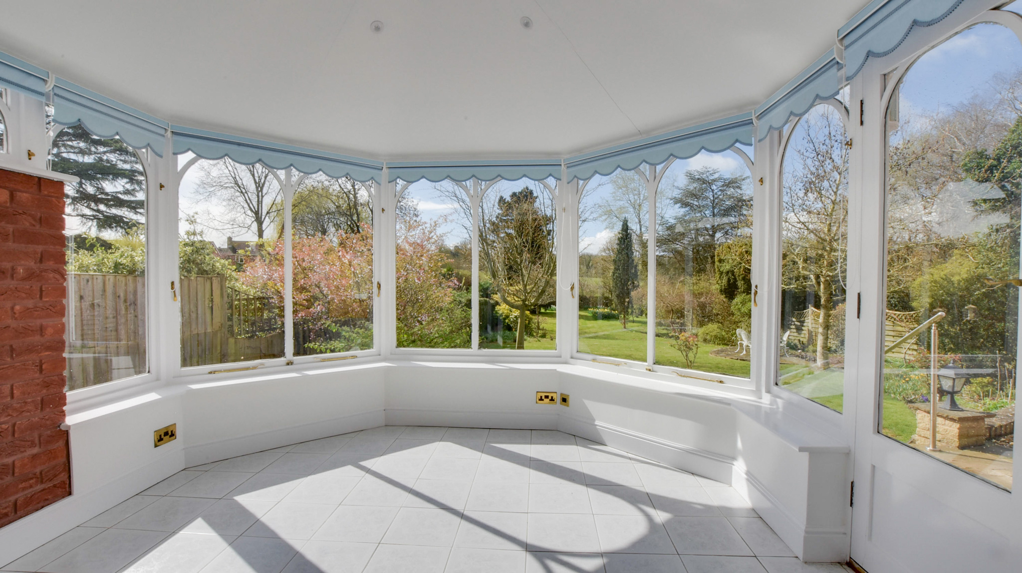 Single-pane glass to the side and rear elevations, tiled floor, slate roof and electric plug sockets.