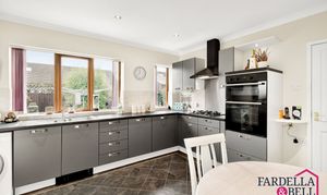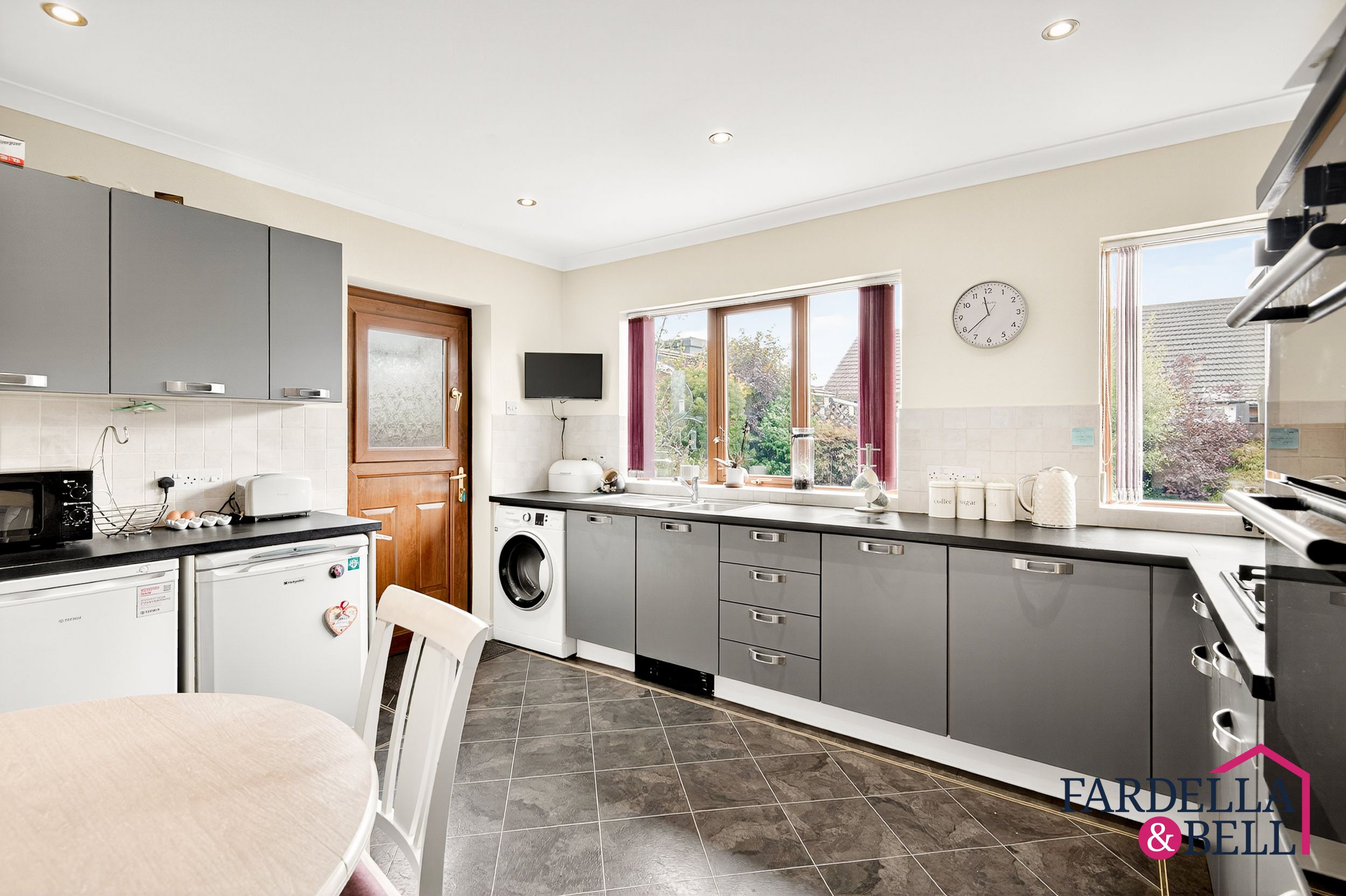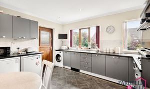 Ceiling coving, spotlights to the ceiling, a mix of wall and base units, uPVC double glazed stable style door, two uPVC double glazed windows, washing machine point, fridge point, freezer point, integrated oven and grill, partially tiled walls, radiator, space for table and chairs, gas hob with overhead extraction point.
