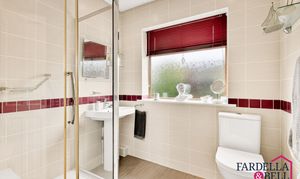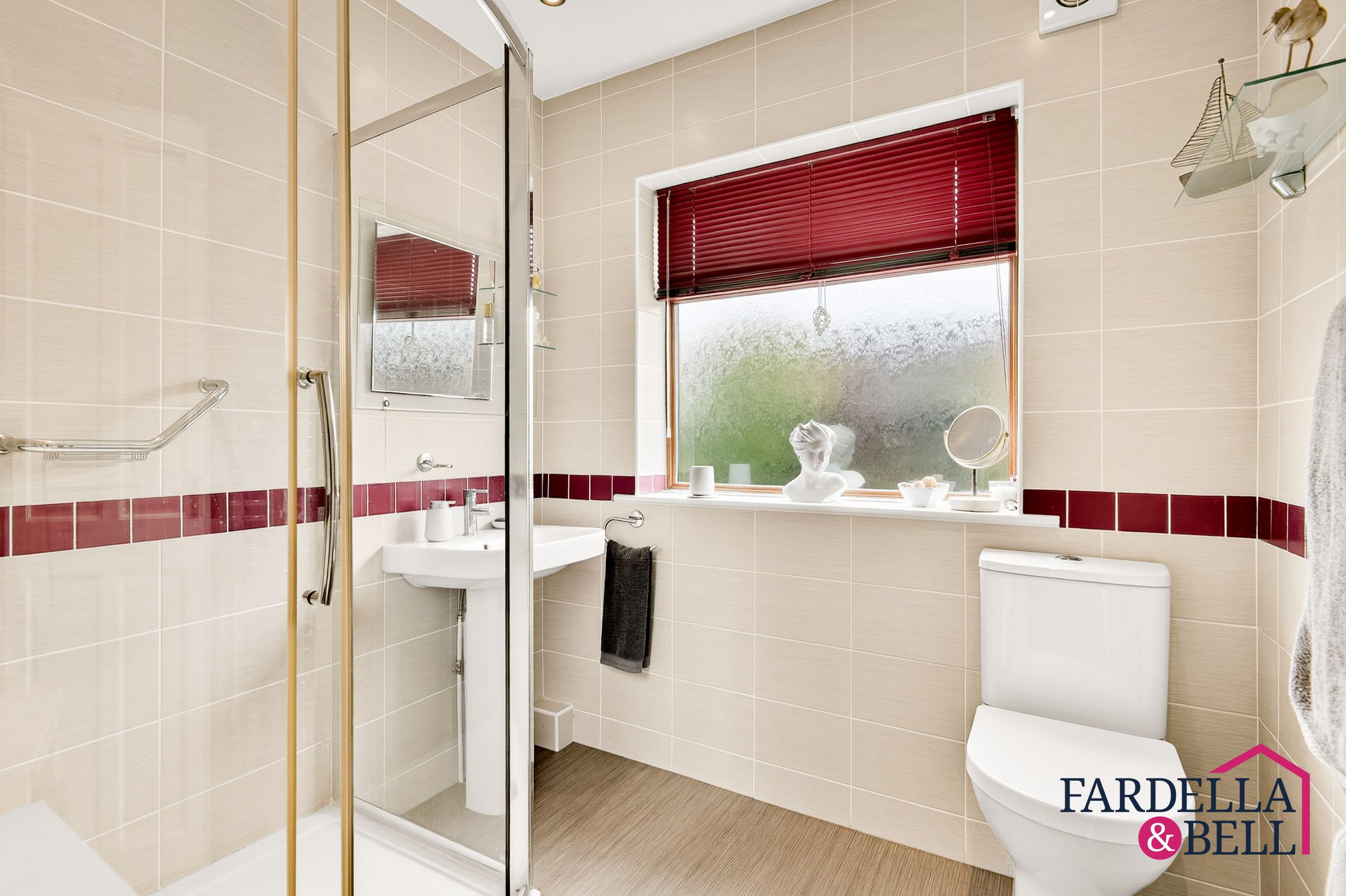 fully tiled walls, frosted uPVC double glazed window, push button WC, sink with chrome mixer tap, towel rail, shower enclosure with mains fed shower and spotlights to the ceiling.